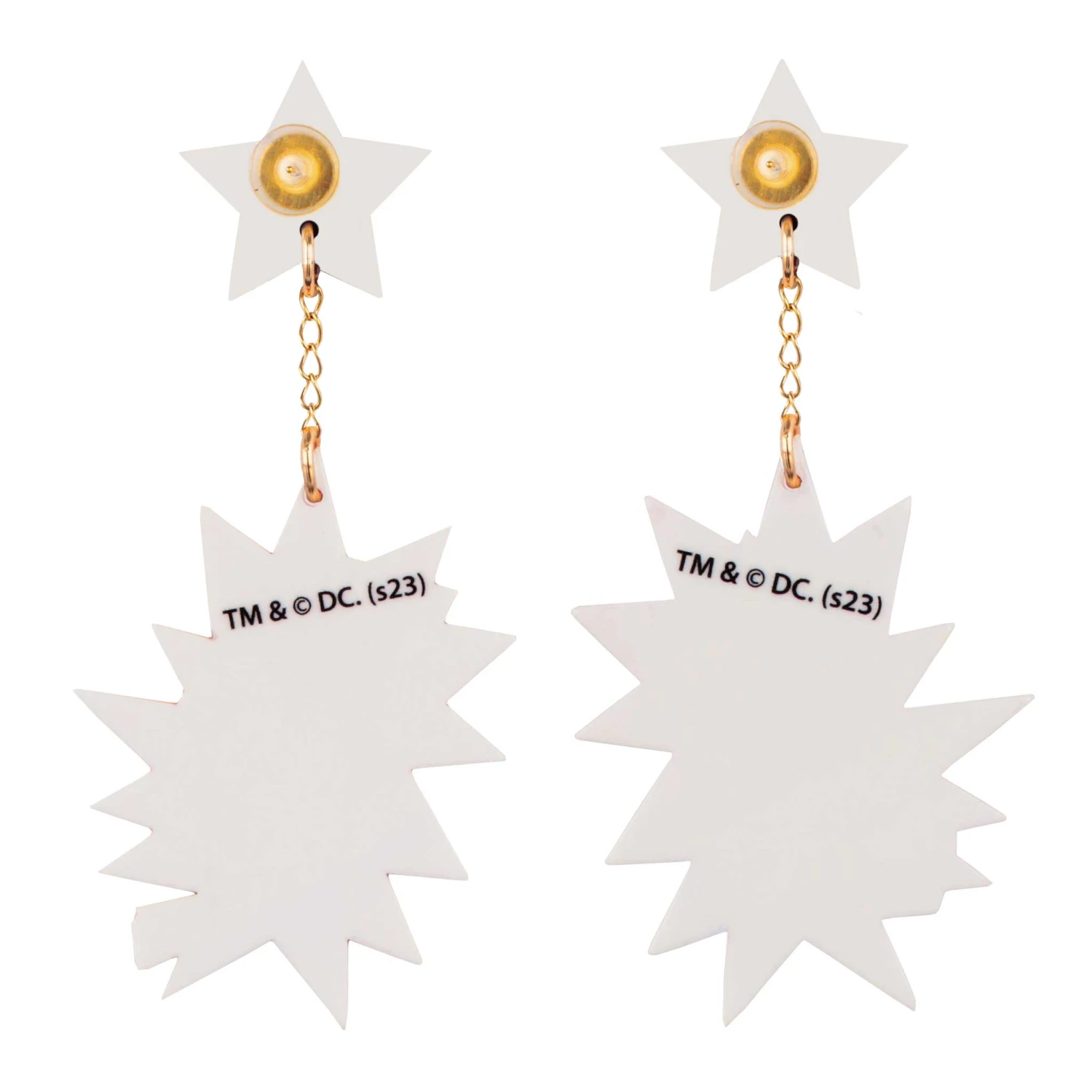 The ultimate comic book style, these high concept acrylic earrings are BLAM-tastic! BAM! POW! Each earring hangs from a contrasting star emblazoned with the Justice League logo, with a golden link chain drop and post fastening. Supplied in a Justice League branded gift box for ultimate impact!