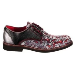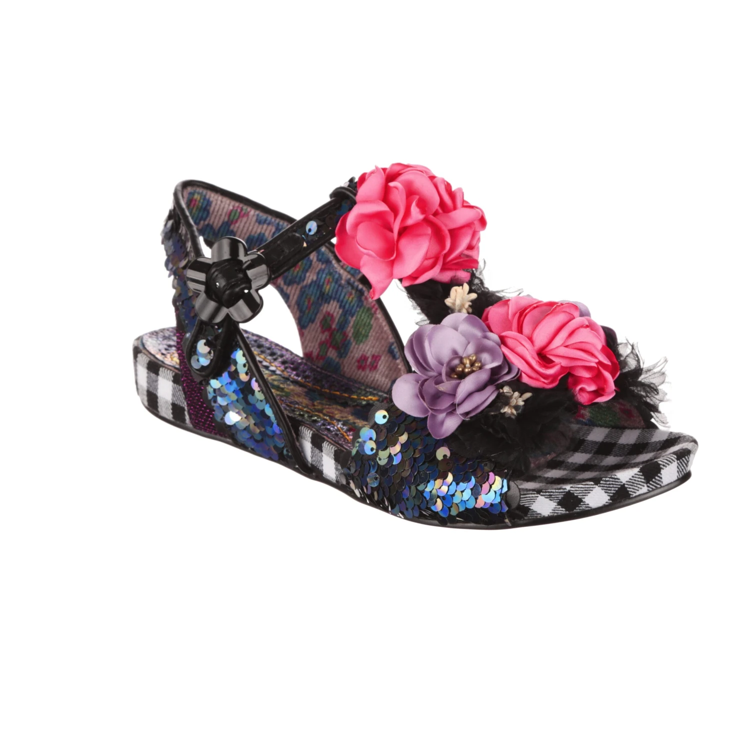 These sandals are a floral fantasy! Black and pink flowers cover the t-bar, and reversible sequins in sparkling oil slick shades of black, blue and purple cover the strap and heel. Metallic trim covers the shoe, with scalloped details on the heel and toe. The sole is lined with black and white gingham for a vintage feel, and the flower shaped buckle is the cherry on top!
