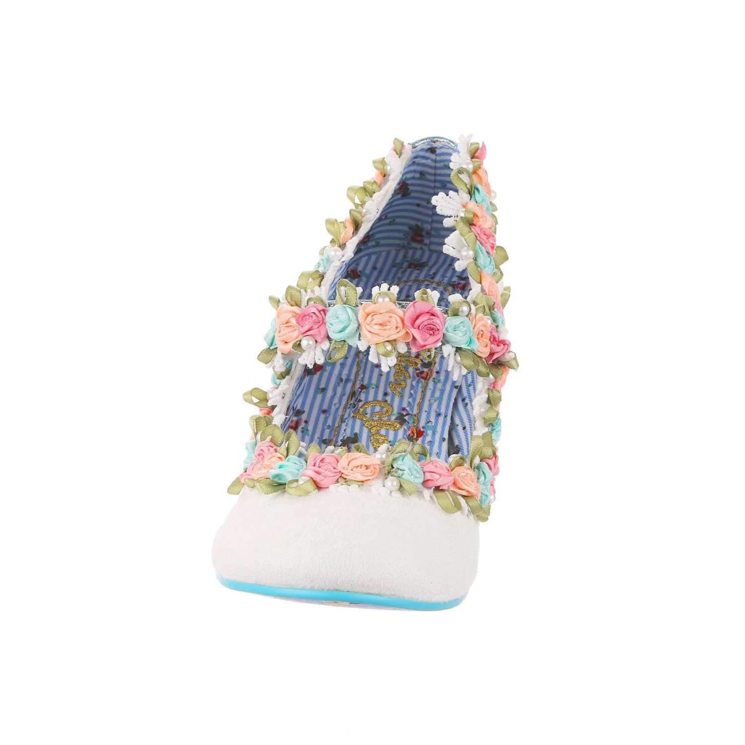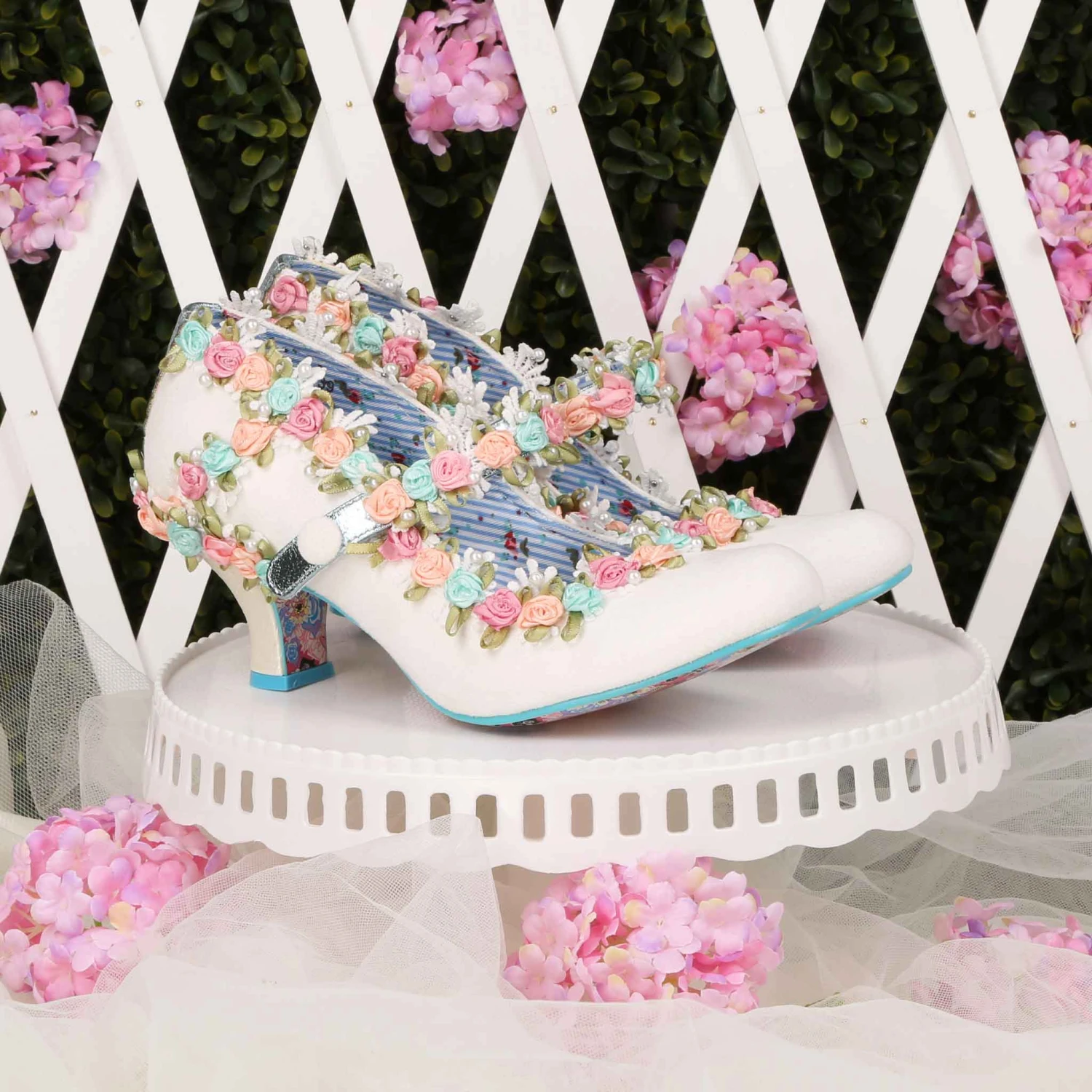 Aren’t these the most darling wedding shoes? These perfect bridal mid heels are adorned with 3D floral trim in blue, pink and orange with green leaves and dotted with pearlescent beads. Even the metallic blue Mary Jane strap is decorated with them! Finished with a wearable white mid heel and fastened with hook and loop that makes them so easy to slip on and off. Make your big day with these beauties!