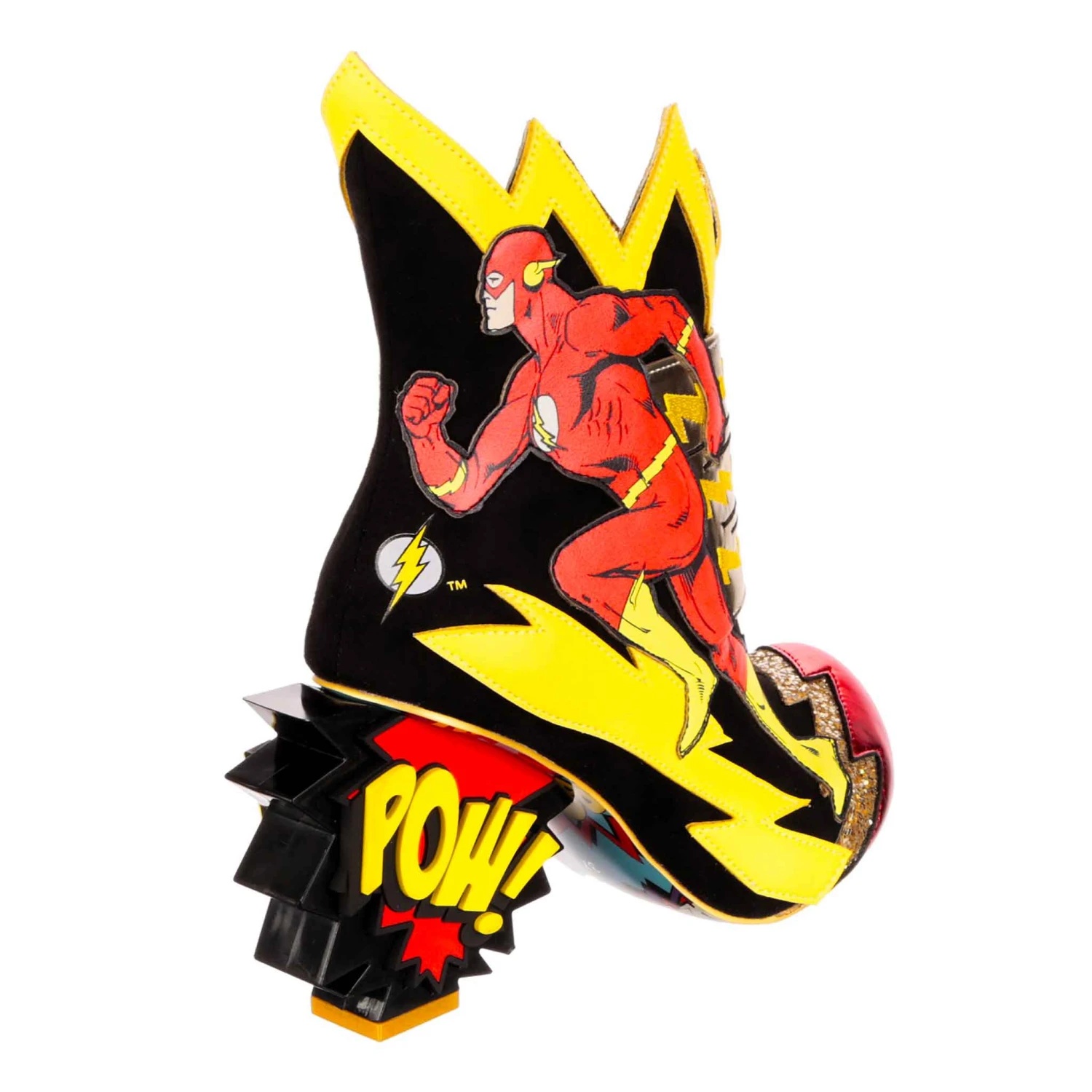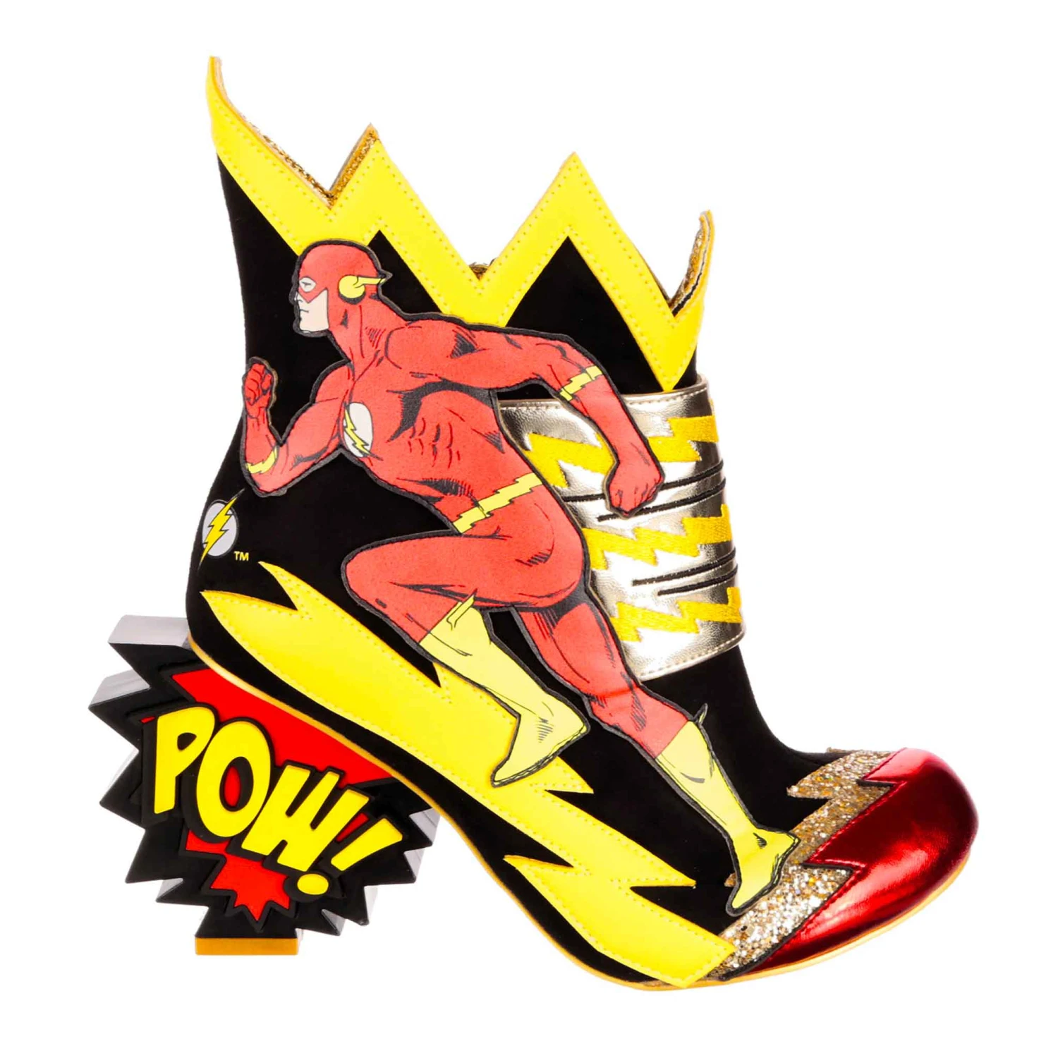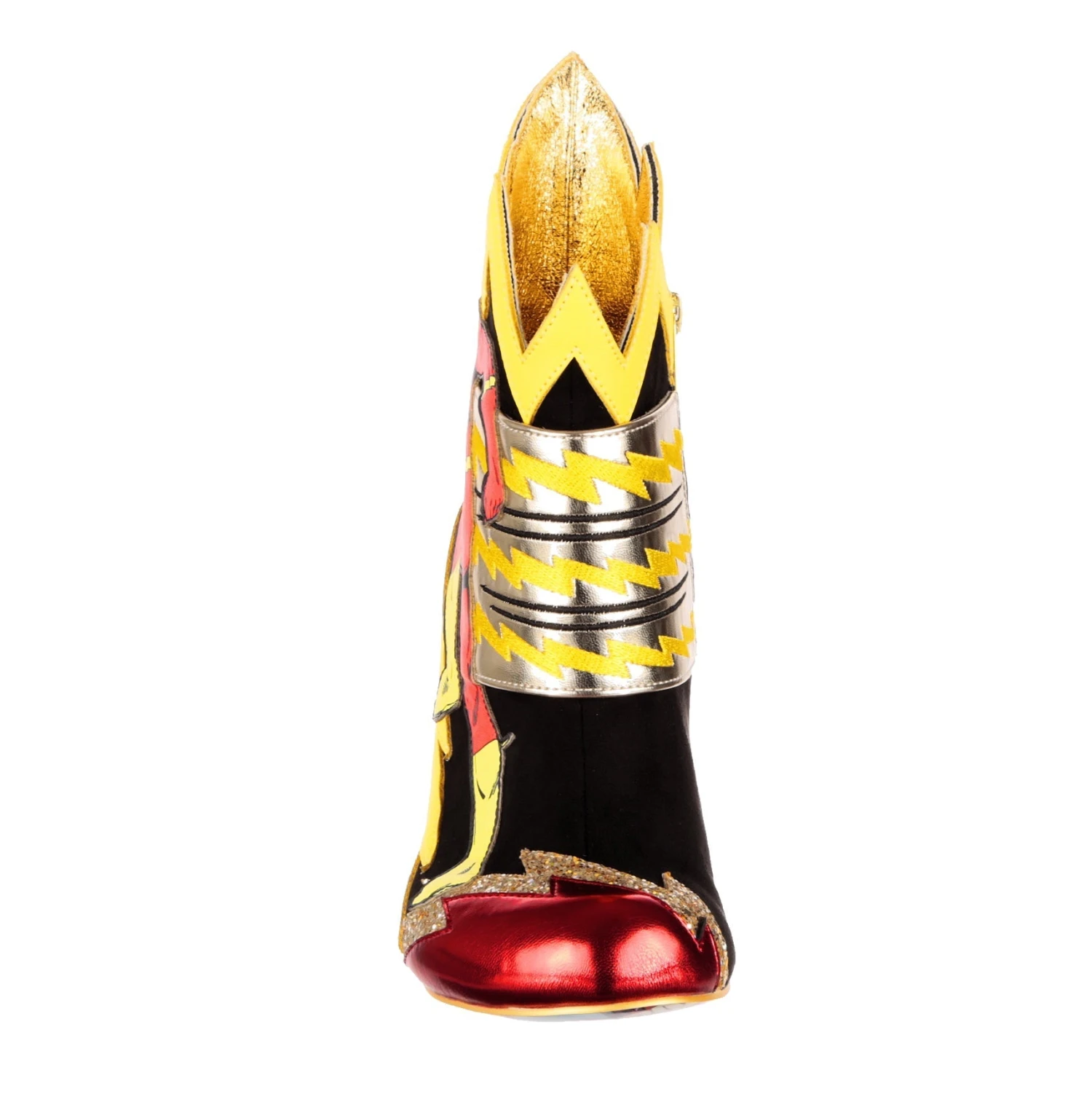 These are the fastest, flashiest boots in town! The Flash dashes along the side of these high heeled ankle boots, leaving iconic zippy zigzags in his wake that echo across the boot in yellow and gold glitter. BAM! POW! The bright graphic comic book inspired heels will make a big impact when you dash out in these shoes! For all fans of The Flash, these zippy zip up boots are a no brainer.