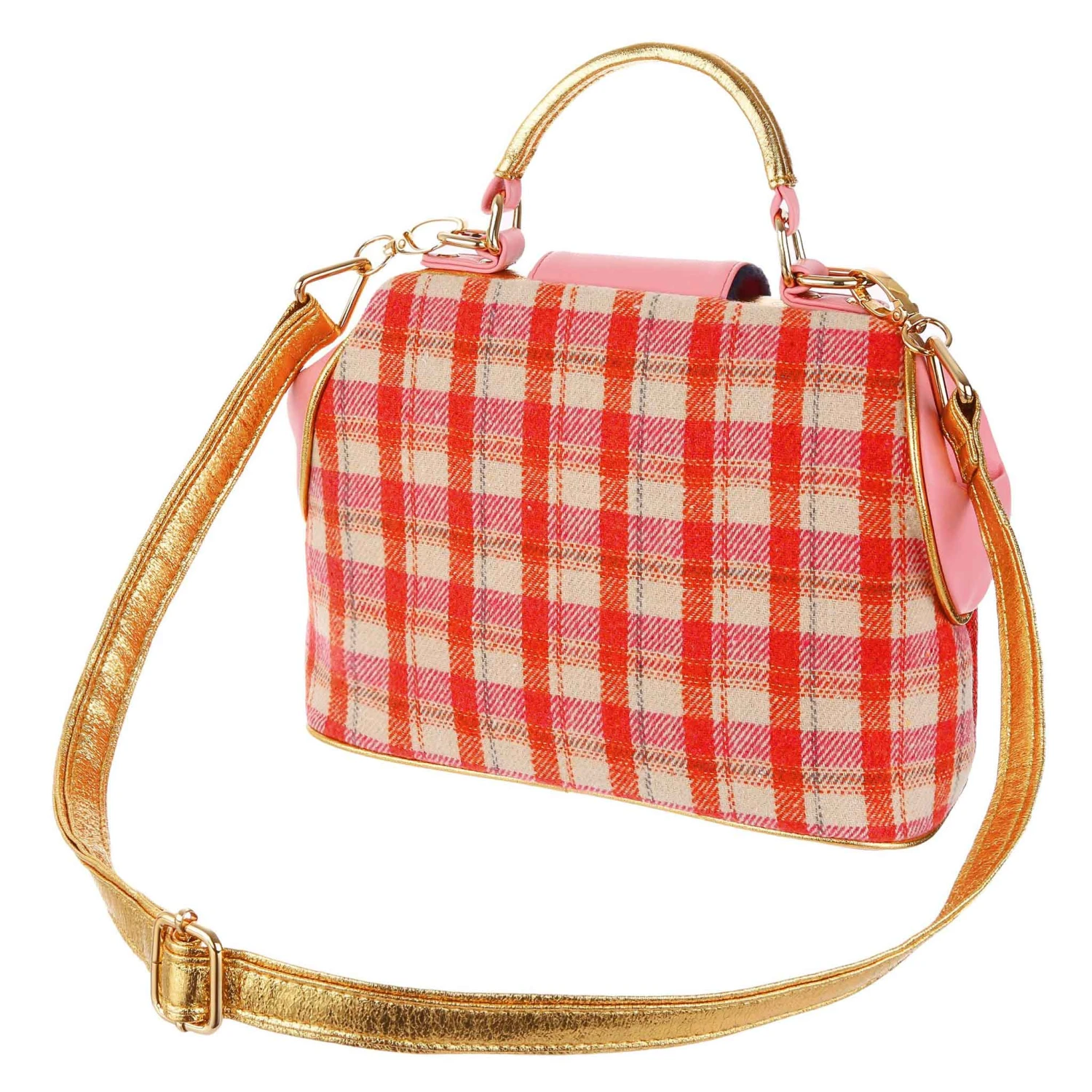Looking for something irresistibly delicious? This doctors-style bag opens out wide to fit all your goodies inside whilst being oh so adorable, studded with sweet cherries over a classic pink and red tartan. The cherry on top of it all is the large pair that sit on the magnetic fastening strap! Around the edges is layered red reptile texture fabric finished with gold piping and a matching carry handle.