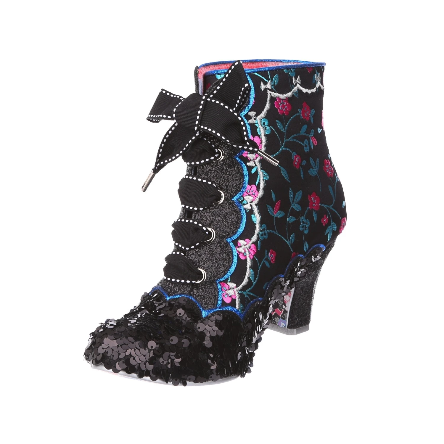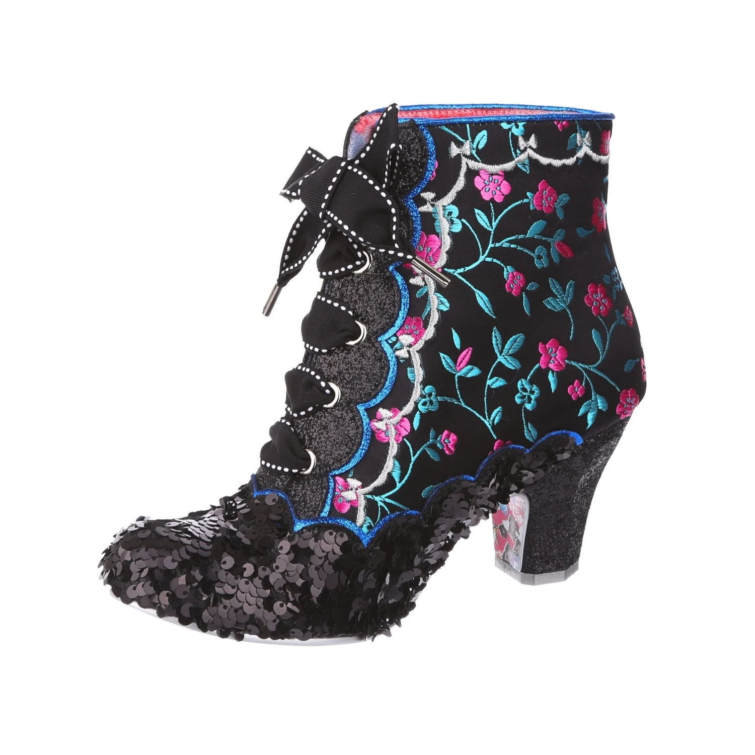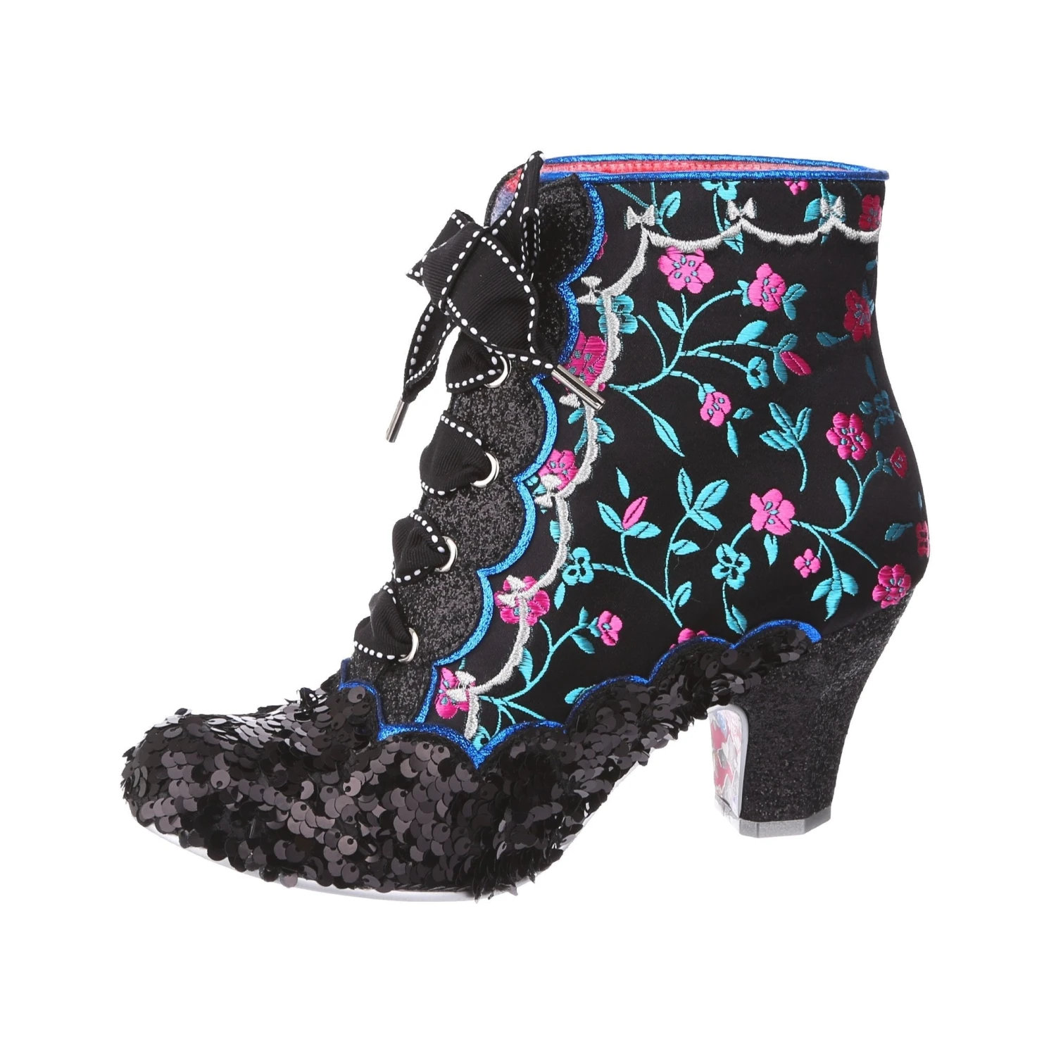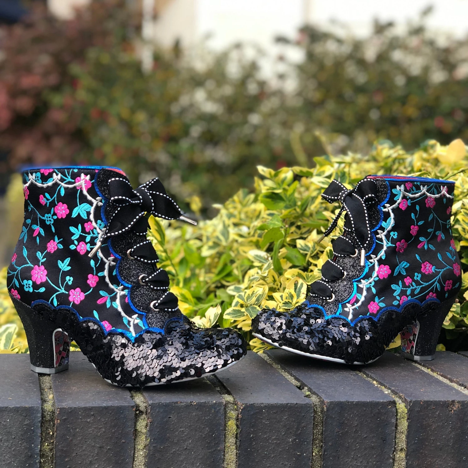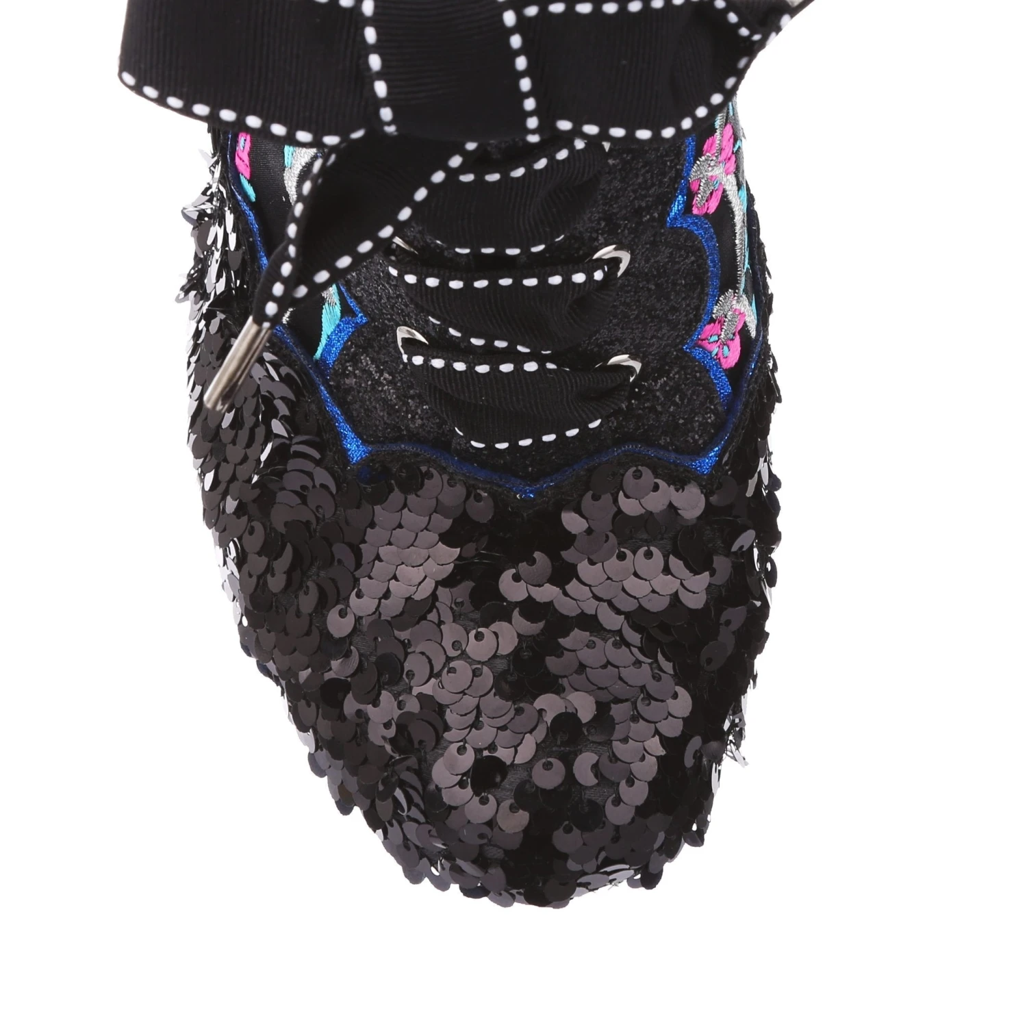 Tired of just wearing boring boots? We have got you covered! These eye-catching wonders are anything BUT boring! Featuring a striking black, fuchsia and teal floral, which is paired with shimmering black sequins and glitter. Extra details include stunning silver embroidery and a fabulous monochrome grosgrain ribbon lace, they are definitely not your average pair! Perfect to wear with skirts, trousers, tights or socks, these lovelies need to be yours today!