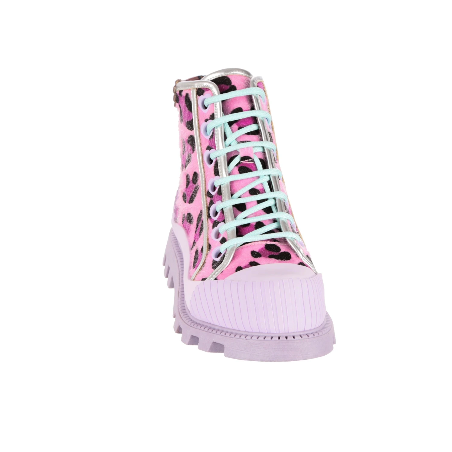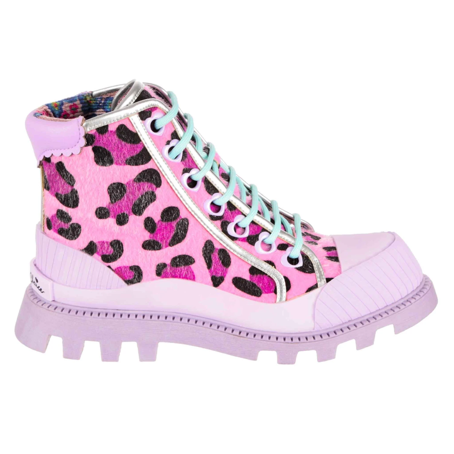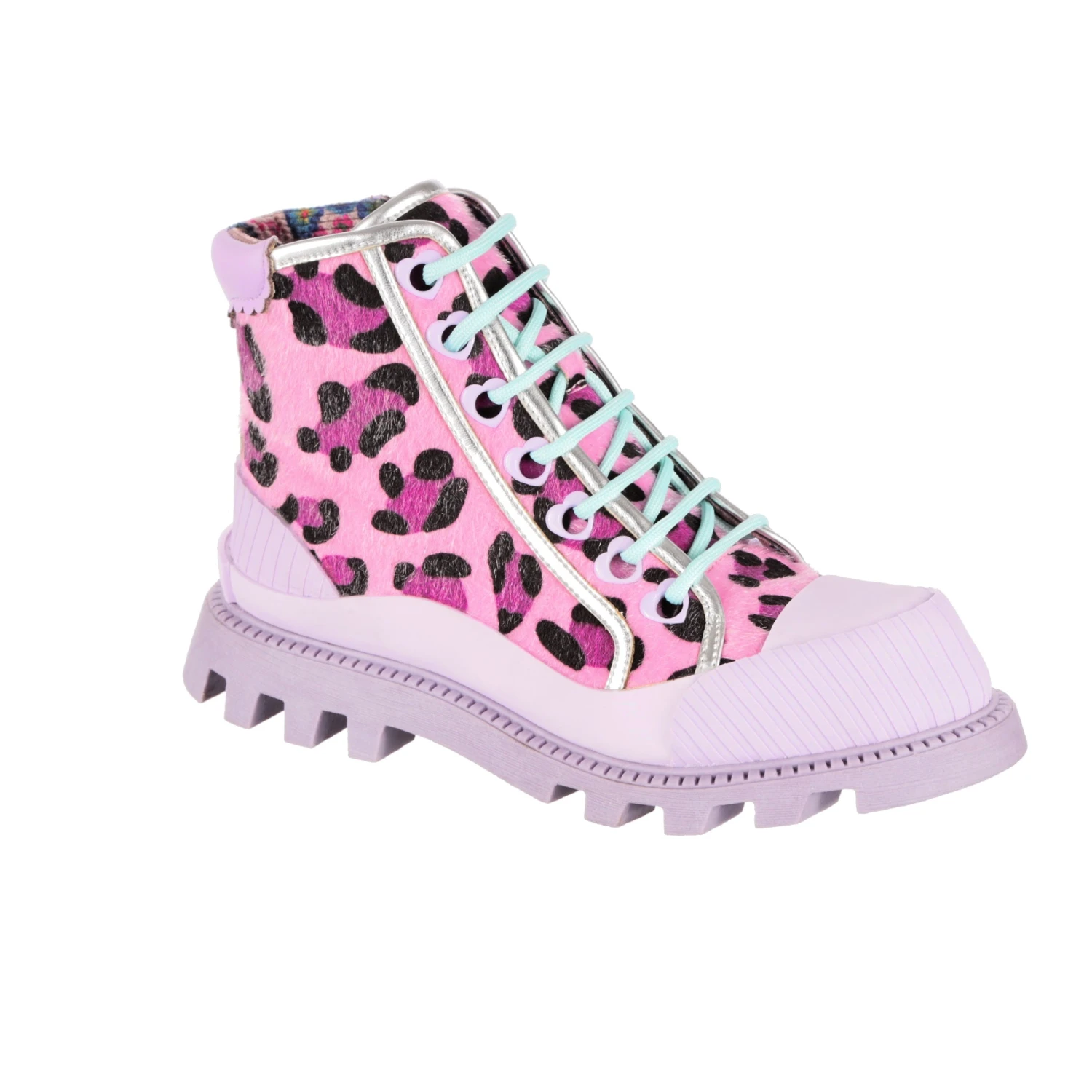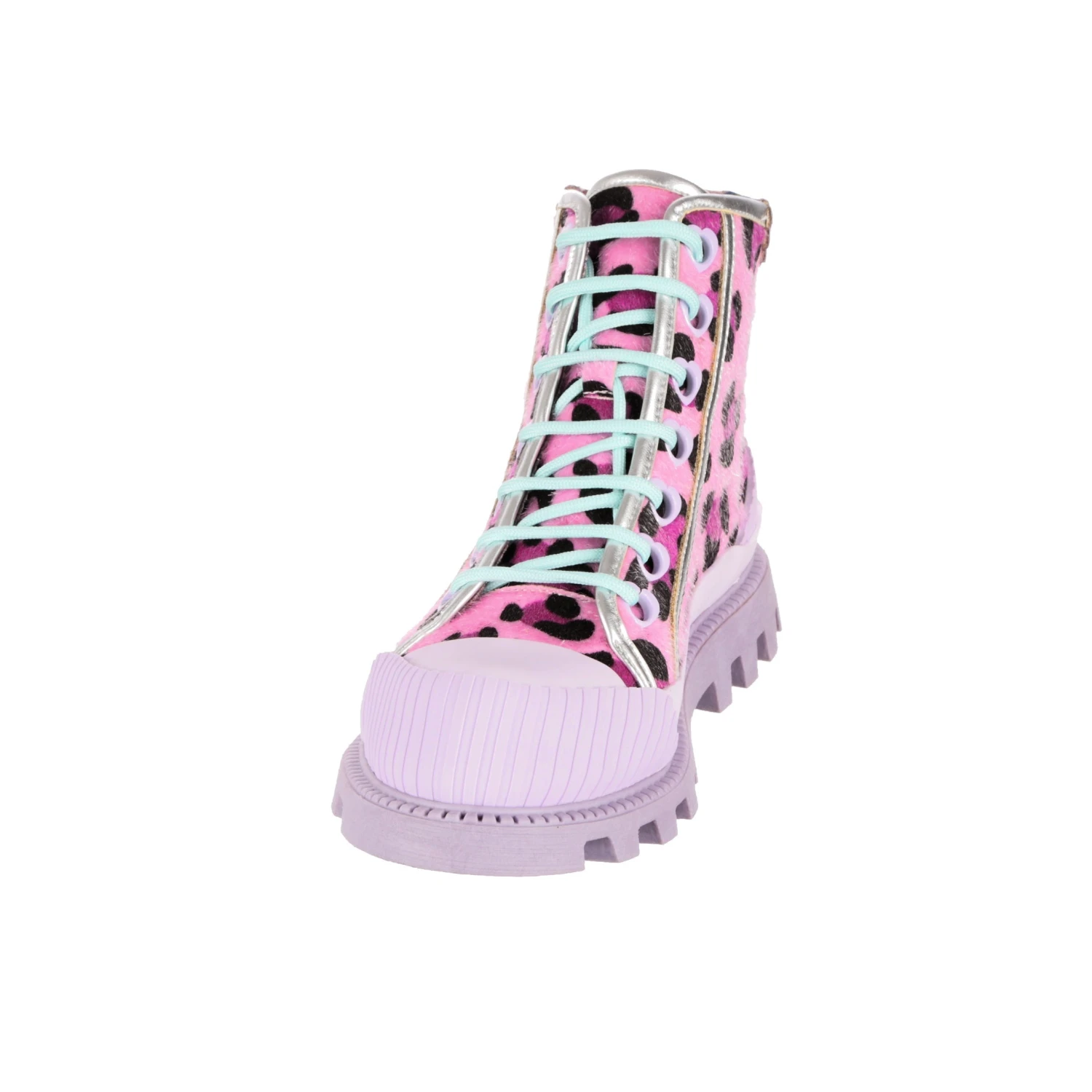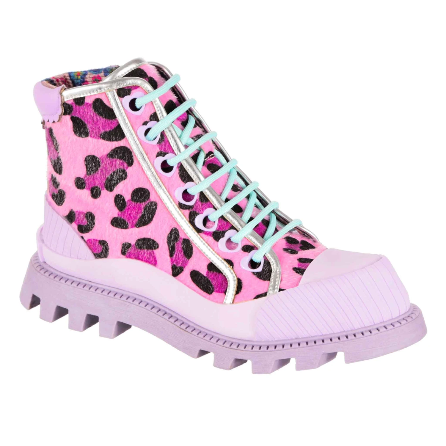 Finish your festival look in style! These vibrant pink and purple leopard ankle boots are perfect to stomp around in, pair with shorts, jeans or dresses for a fun and casual look. Lace up these chunky tread boots and get grooving!