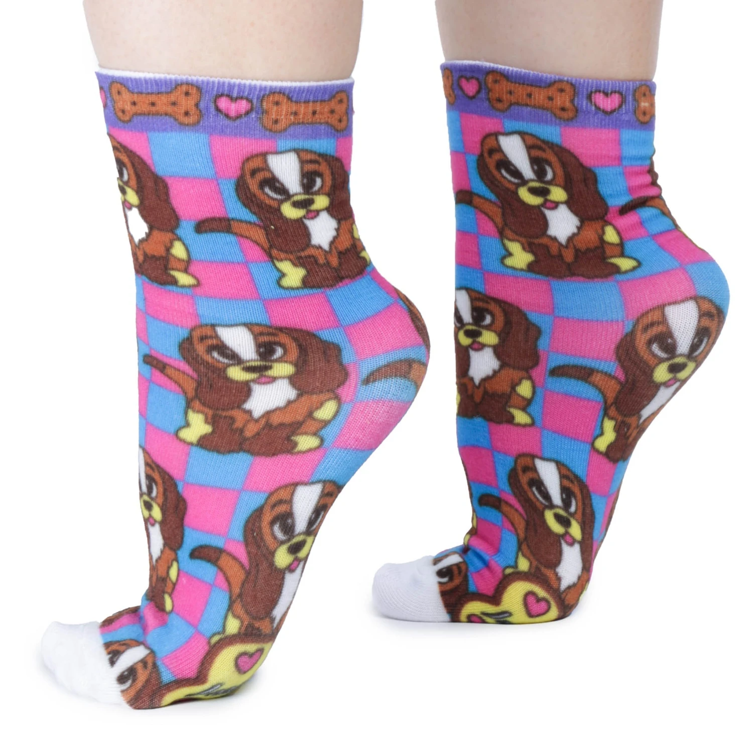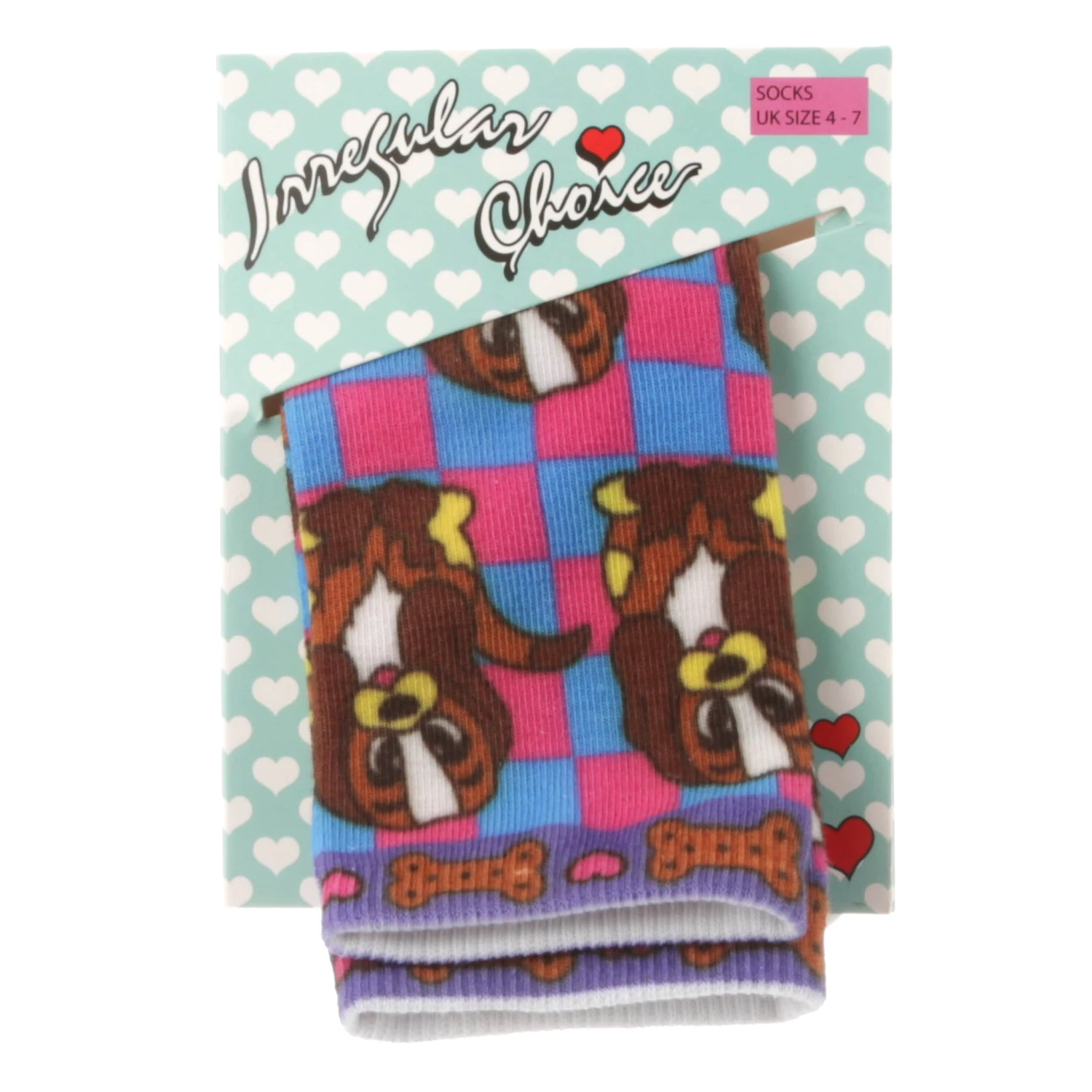 Add some cute to your outfit! An all-over print of adorable puppies on a funky pink and purple checkerboard and trim of cute bones and hearts. These lovely socks look super cute paired with our Barking Mad Collection shoes or to style out on their own!