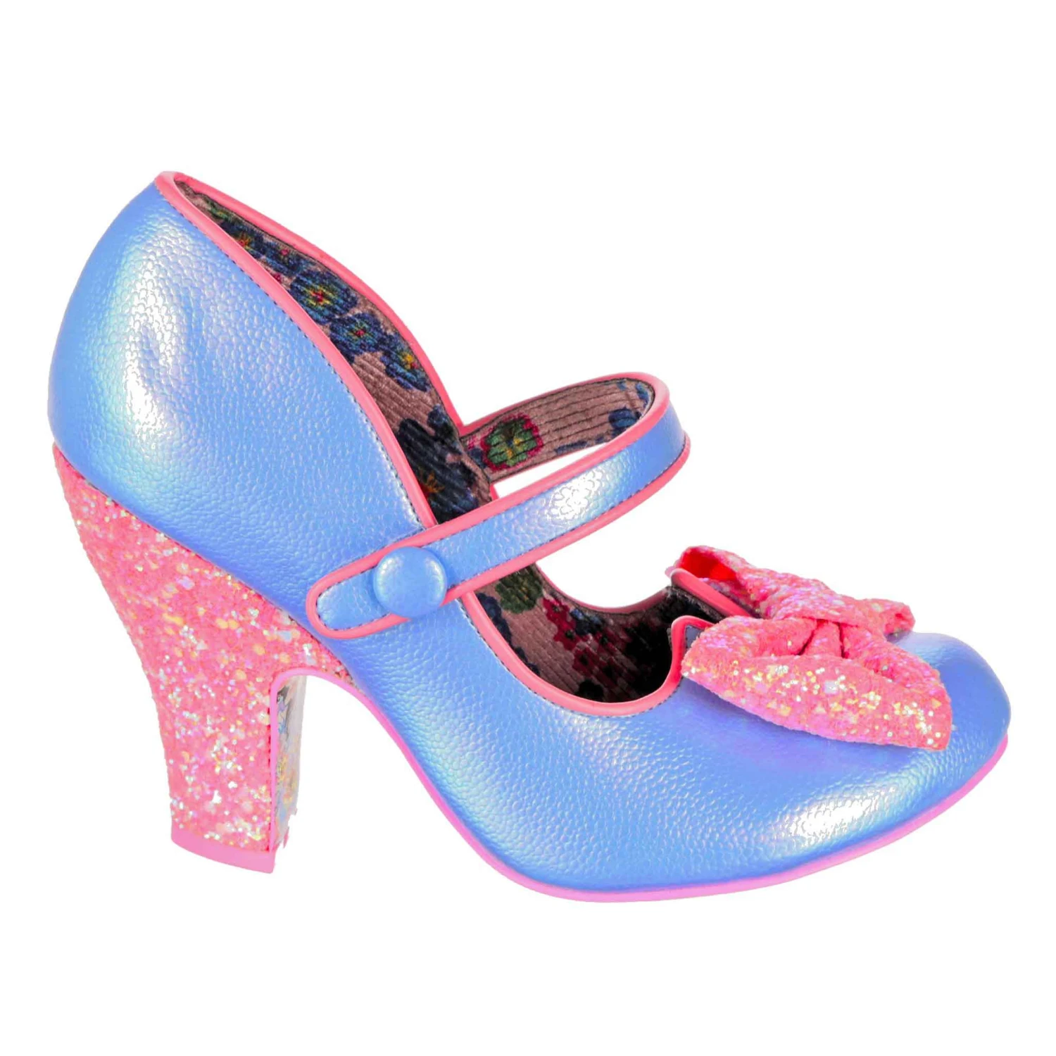 Pastel perfection! These stunning blue and pink high heel Mary-Janes are what every wardrobe needs. Feel ethereal in the shiny pearlescent blue, and the matching chunky pink glitter heel and bow will make sure to catch everyone’s eye! An easy, self fastening ankle strap means they are ideal to slip on and go!