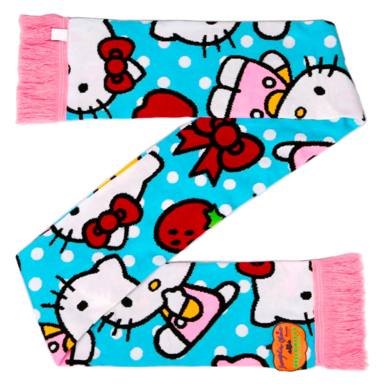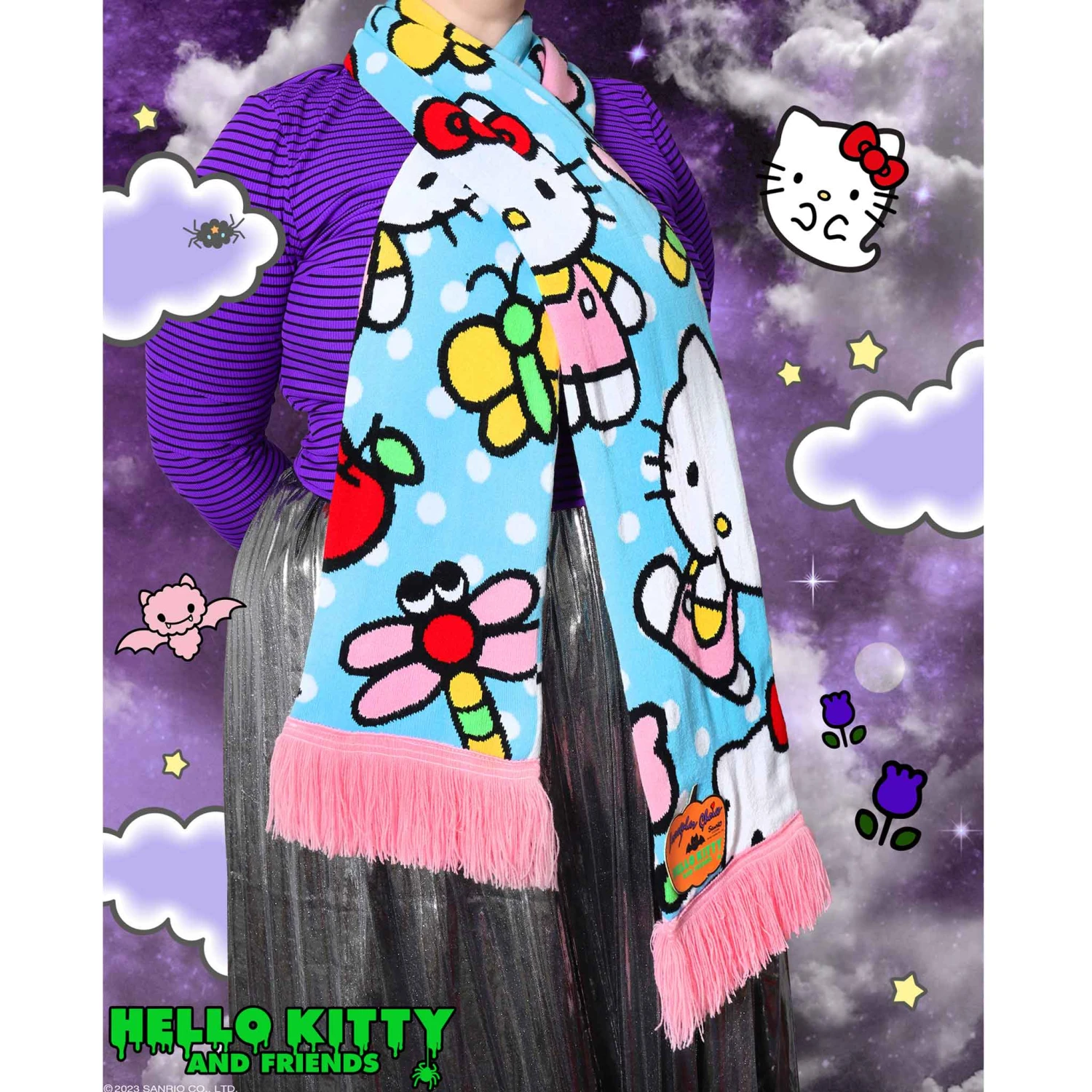 Wrap up warm in this snuggly Hello Kitty knitted scarf! Kitty is striking lots of cute poses in pastel pink dungarees, surrounded by flowers, butterflies and sweet strawberries. All wrapped up on baby blue polkadot design, with super soft pink tassels and a Hello Kitty Halloween pumpkin branded label.