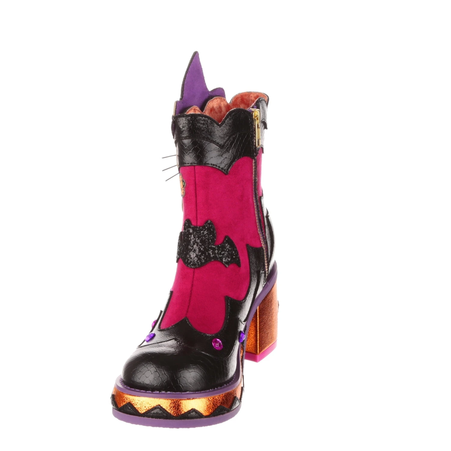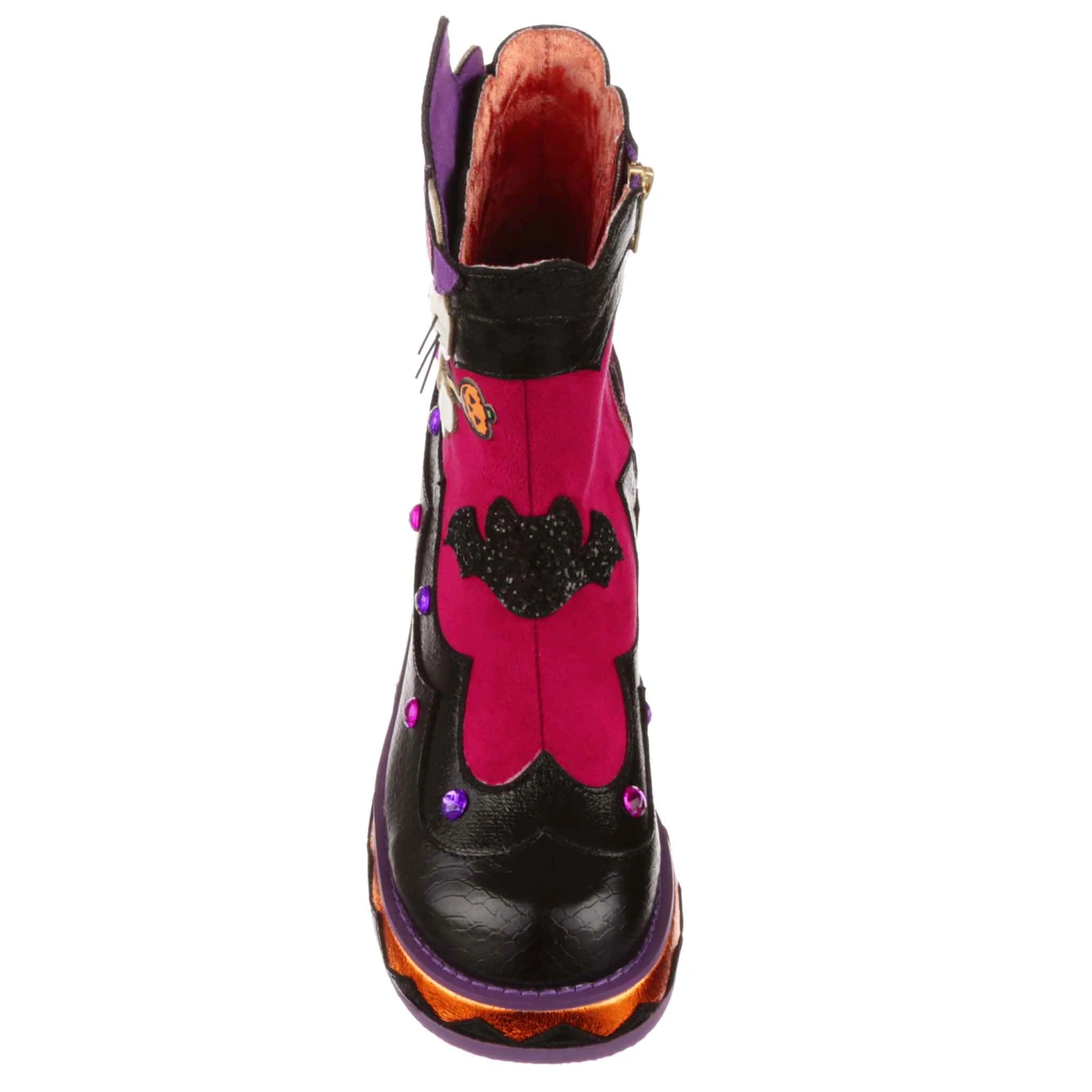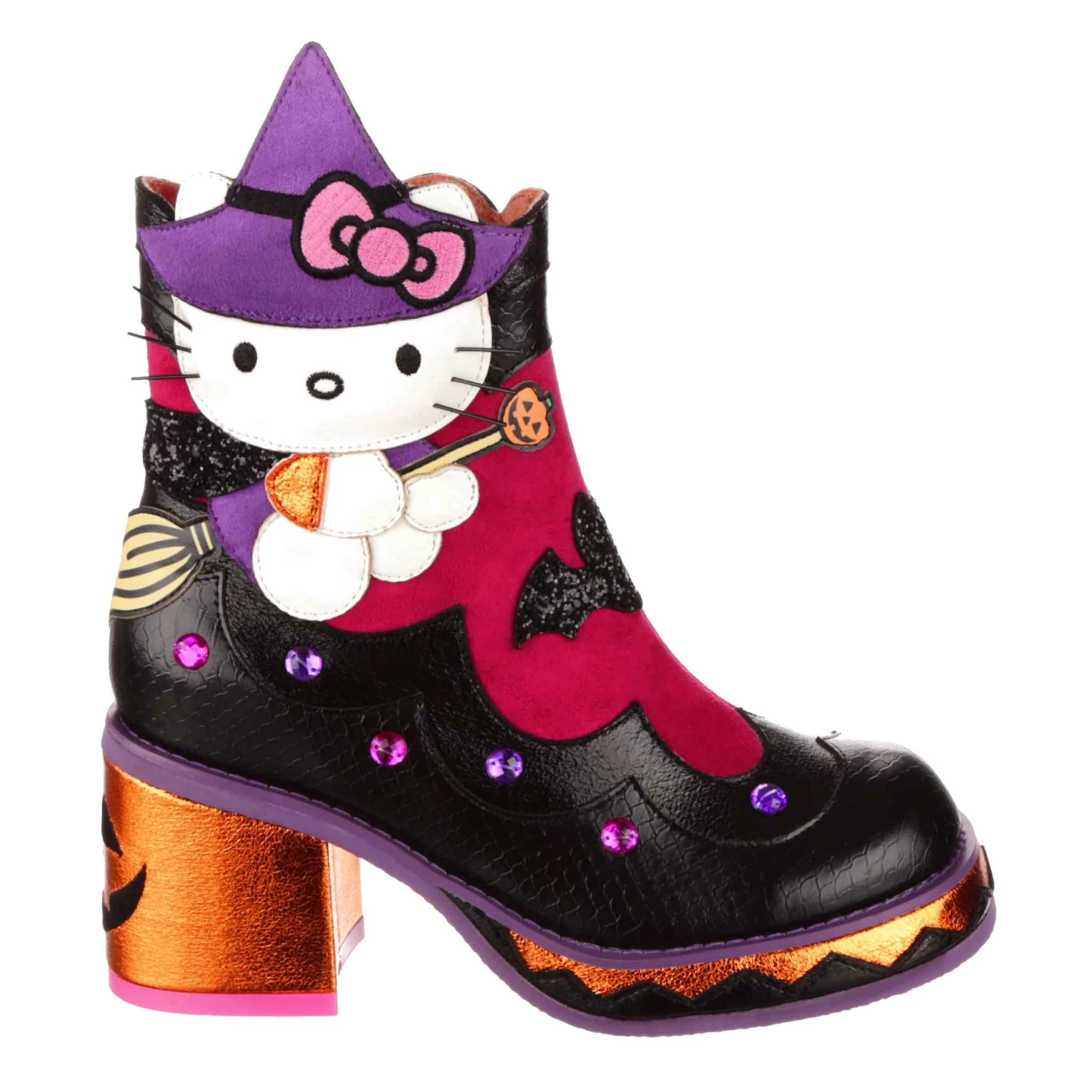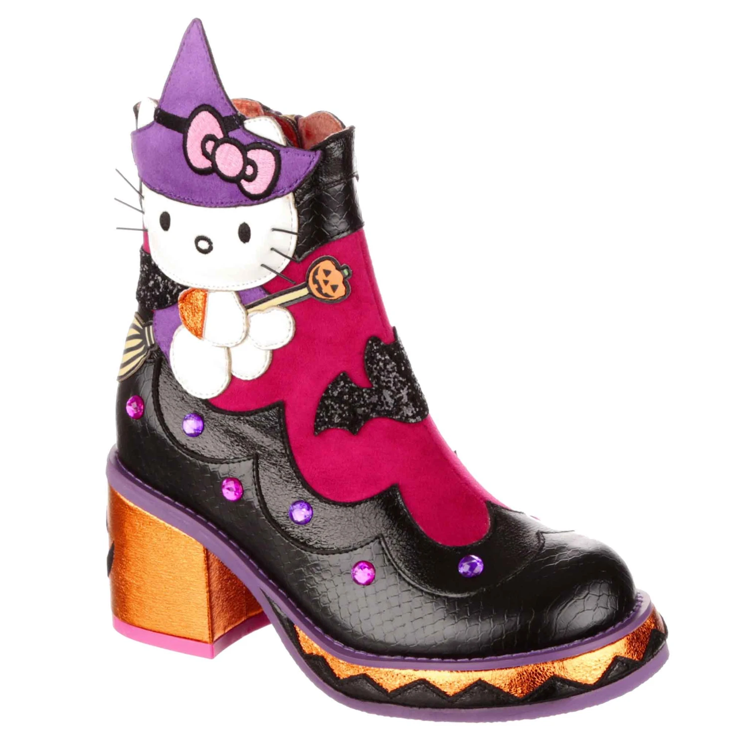 Say Hello to Witchy Kitty! Hello Kitty is dressed up as the cutest little witch on these chunky platform ankle boots, sweeping across the sky on her broomstick with her bat buddies in tow. Zip yourself into this comfy bejewelled pair, dressed in autumnal spooky-season tones of red, purple and black, all finished with a jack-o-lantern pumpkin design block heel and zig-zag details around the platform toe. Take Hello Kitty on your ultimate Halloween adventure in these platform boots!