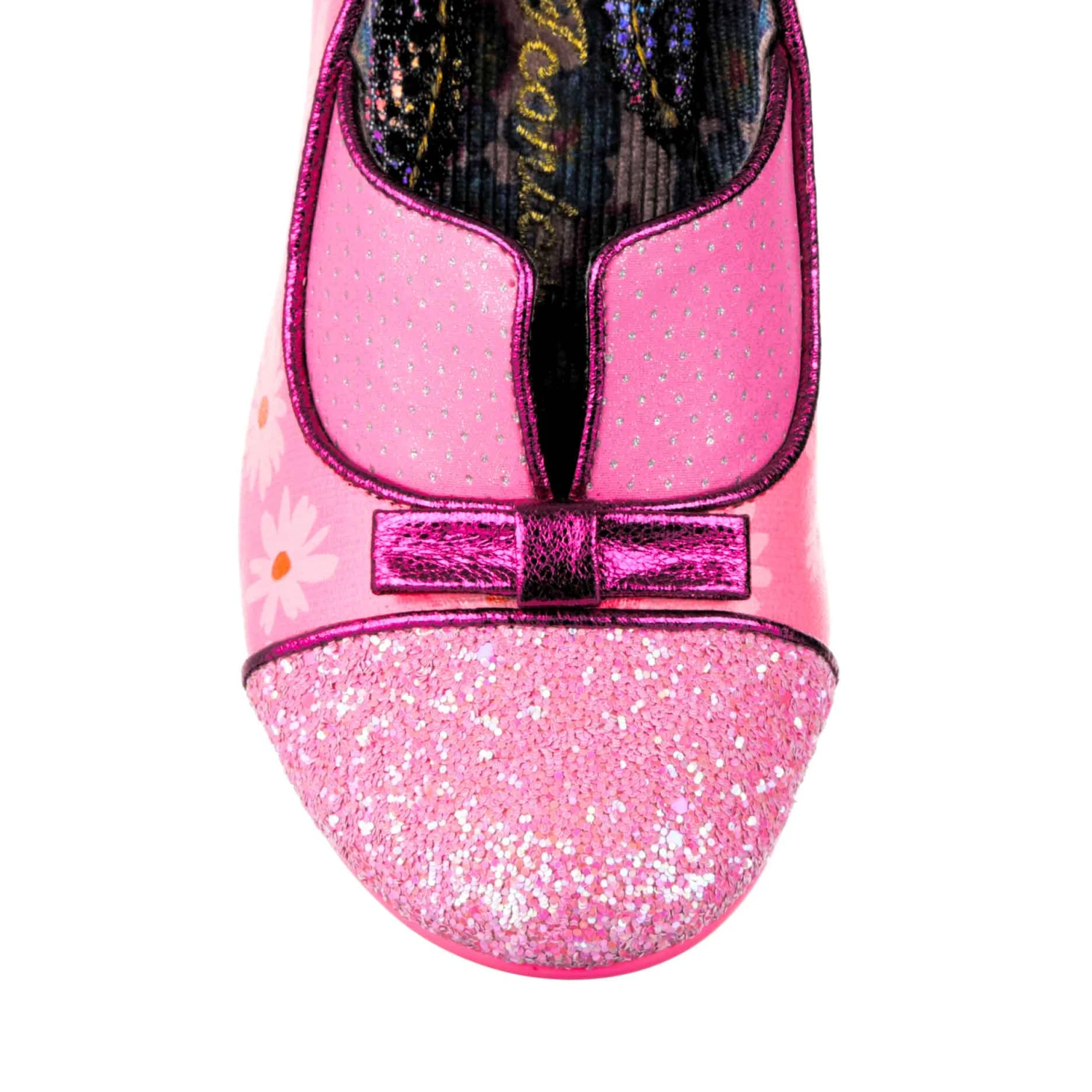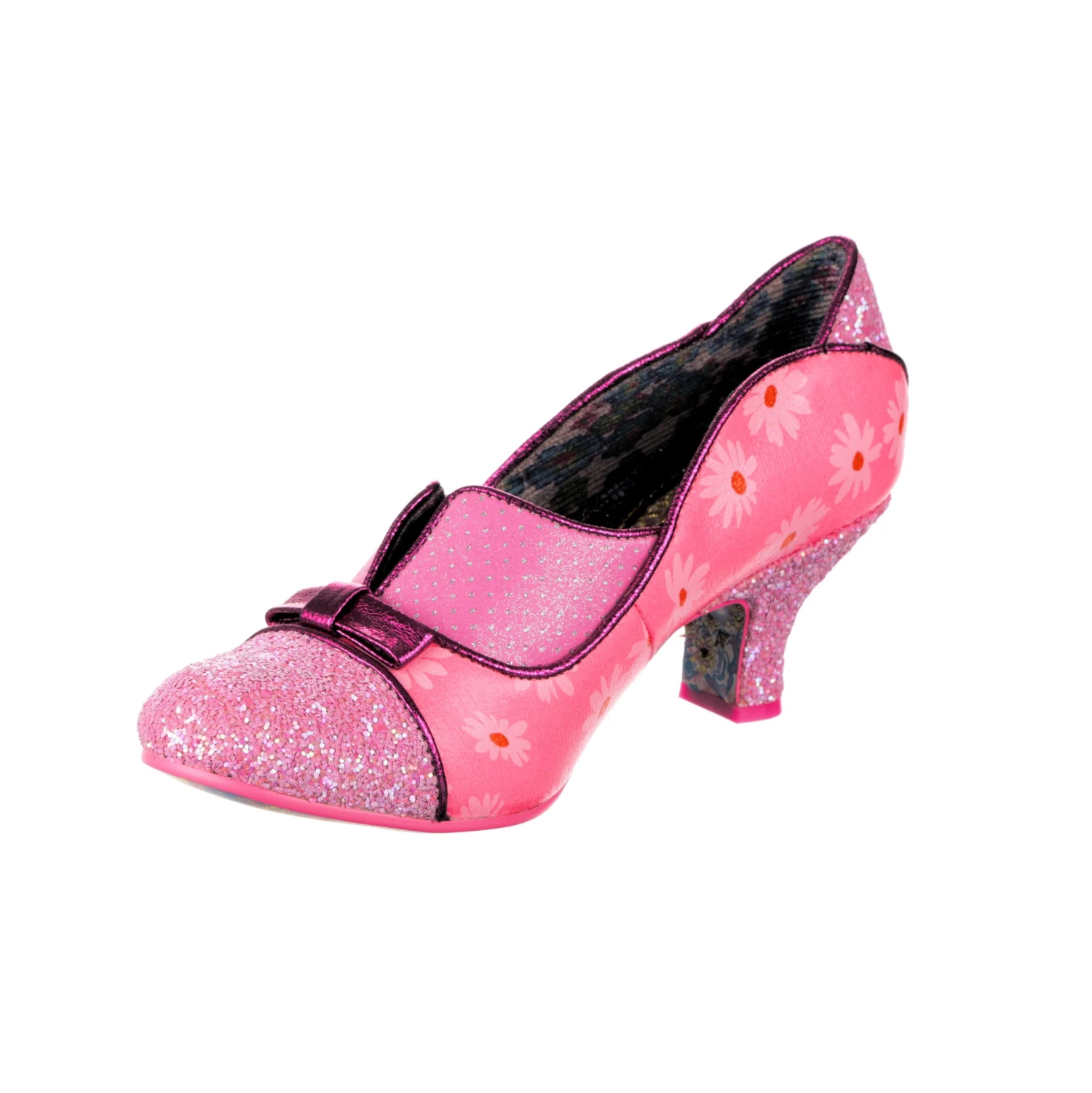 Slip your feet into these super wearable fan faves. Add some subtle shimmer to your wardrobe with these bold pink floral mid heel shoes. A pink and silver polka dot front has a split vamp that makes them easier to get in and out of and topped off with an adorable bow. A pink glitter mid heel is the perfect height for all day wear, so comfy you won’t want to take them off!