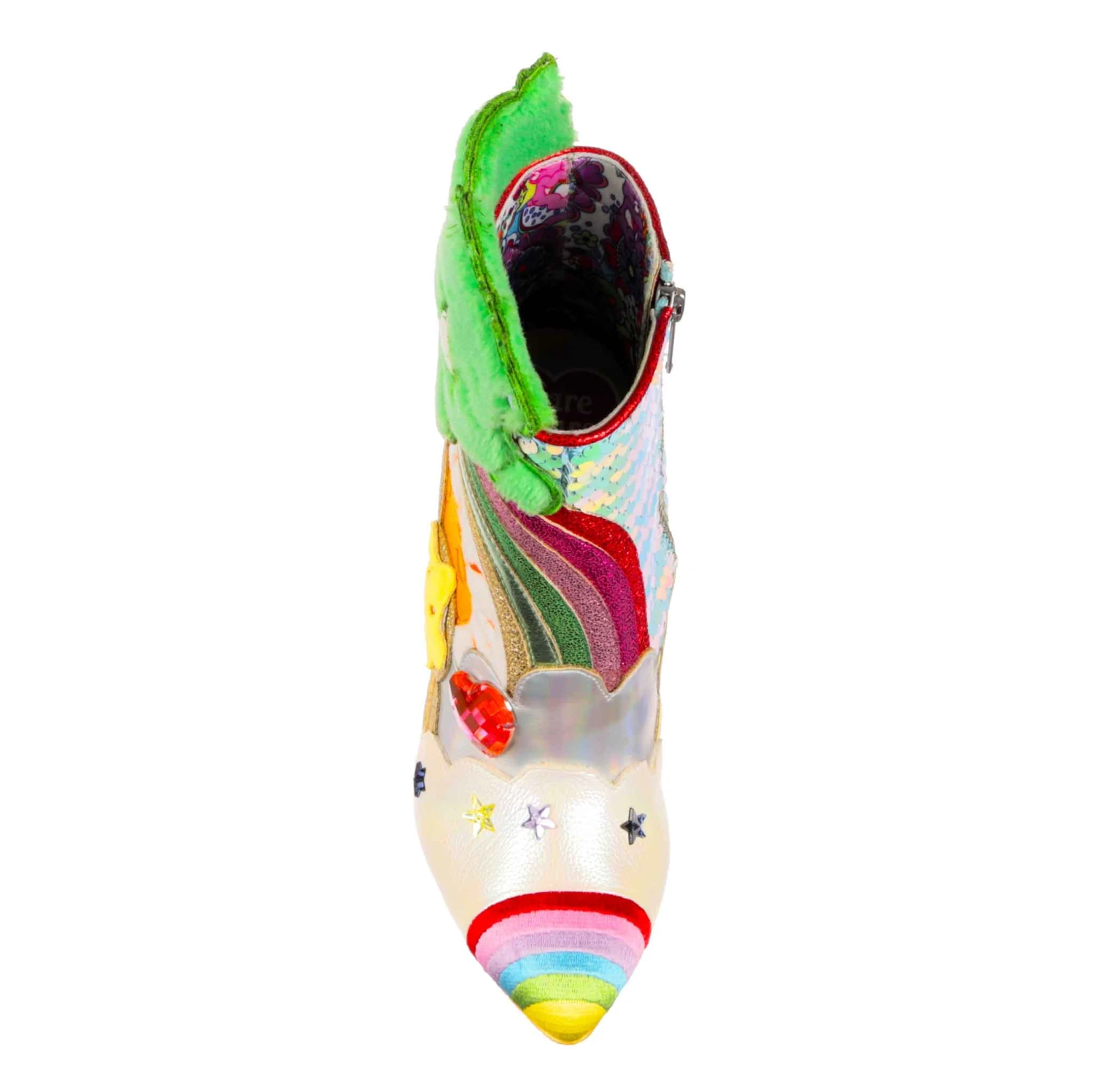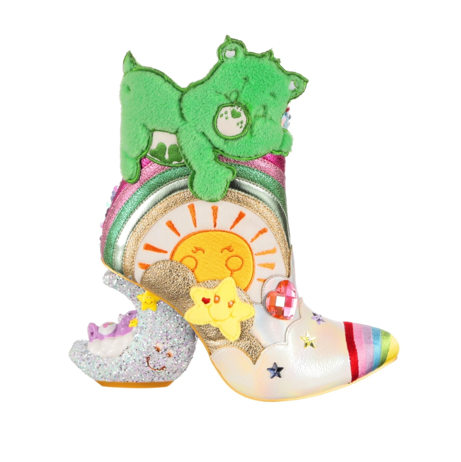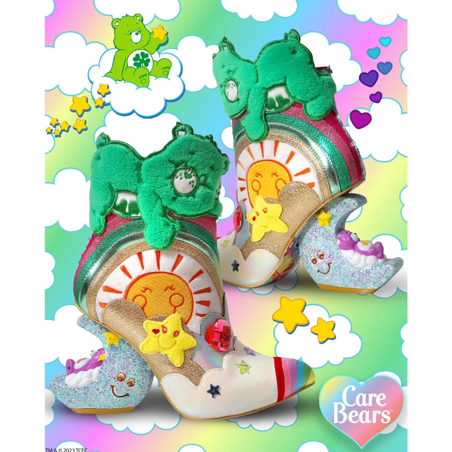 Keep calm and snooze on in a pair of these dreamy Care Bear boots! Featuring a very sleepy Good Luck Bear snoozing on top of a glitter rainbow. A happy embroidered sun, metallic clouds, sequins and 3D star-shaped creatures sit atop a sparkling crescent moon shaped concept heel – with very sleepy Best Friend Bear having a nap on the moon.