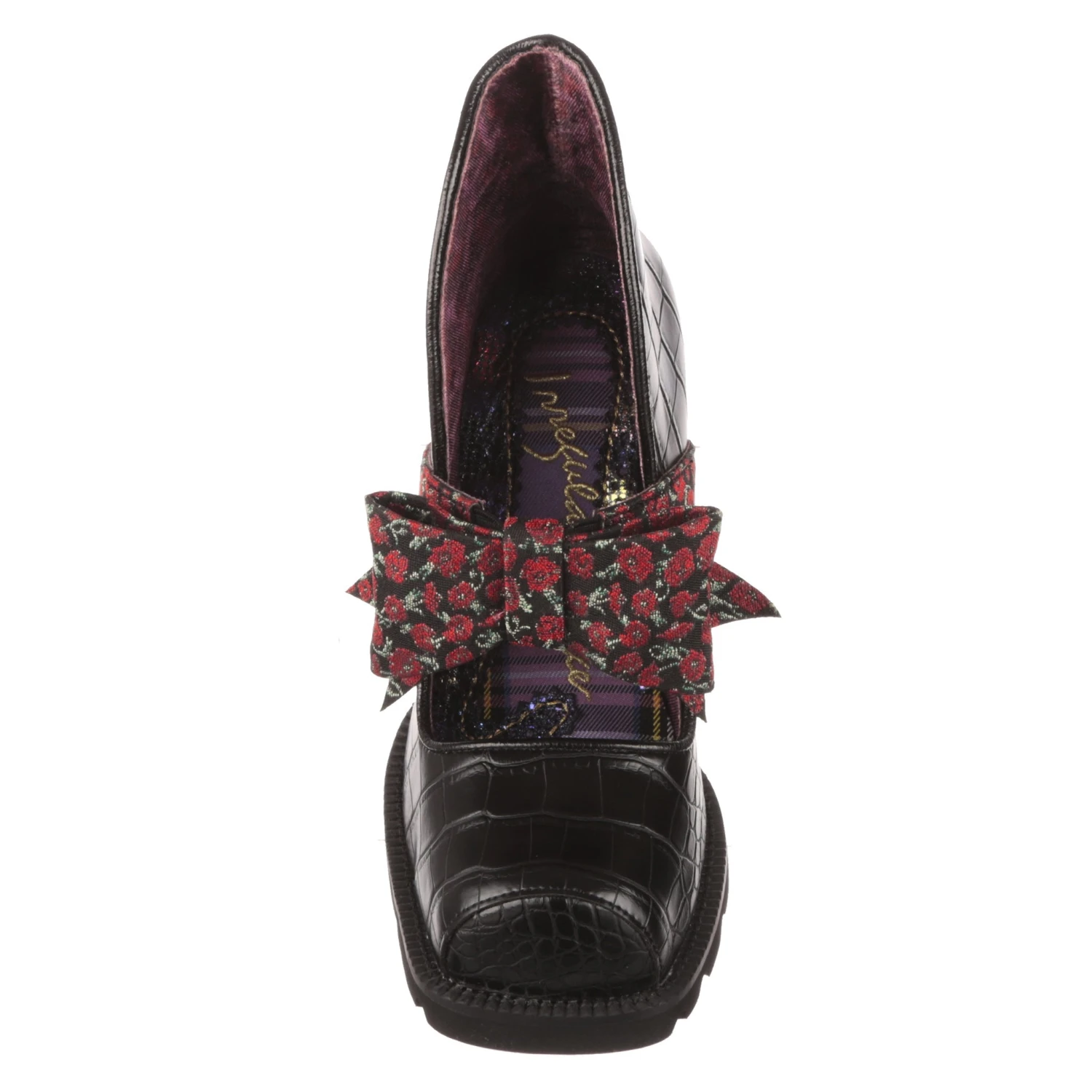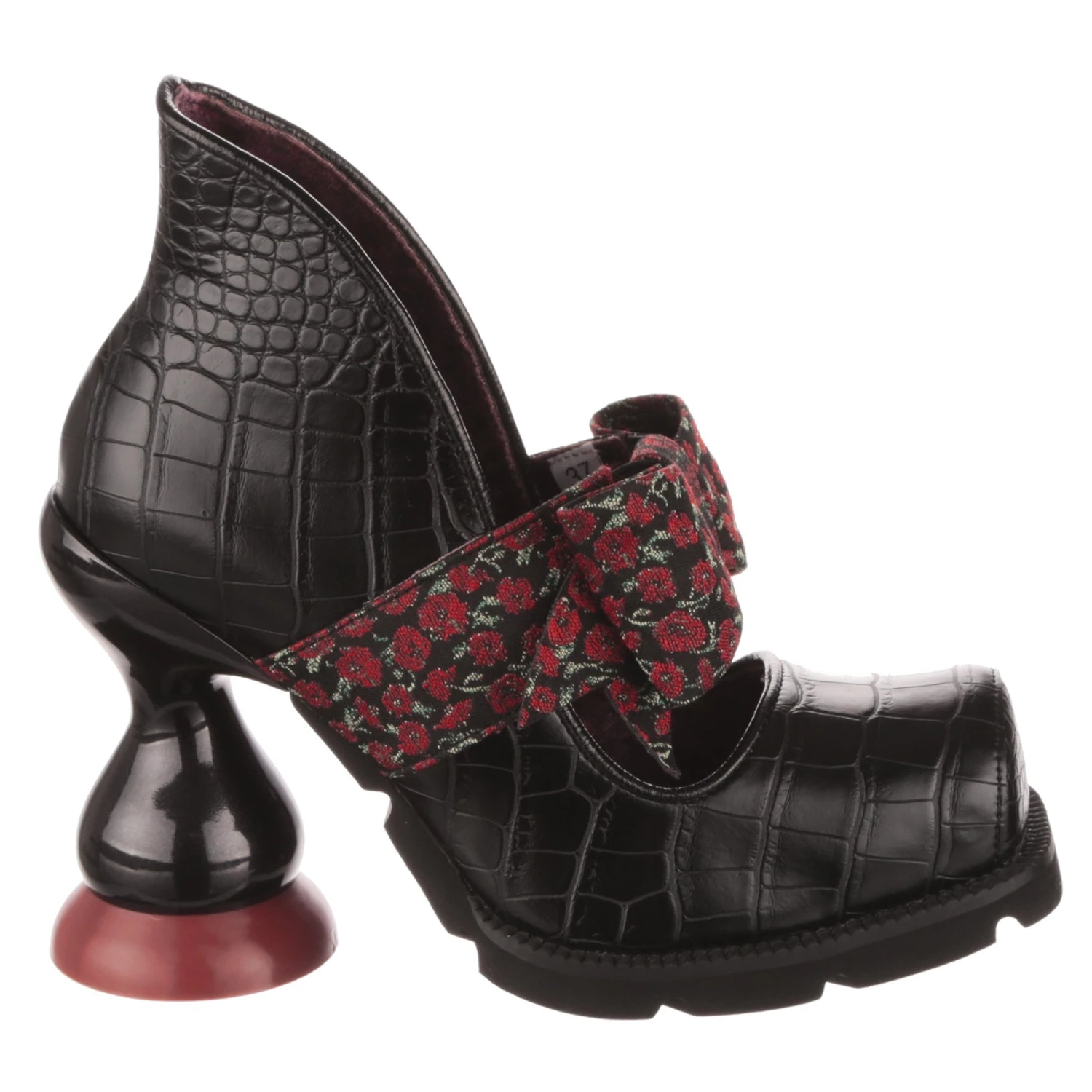 Make a statement in these square toe high heels in a black mock croc and the curvaceous heel is a contrast to the severe toe shape. A large red brocade bow with hidden elastication provides that needed cross-strap security, and also a bit of 90s floral femme drama. This retro inspired shoe is a work of art and you won’t regret adding it to your collection!