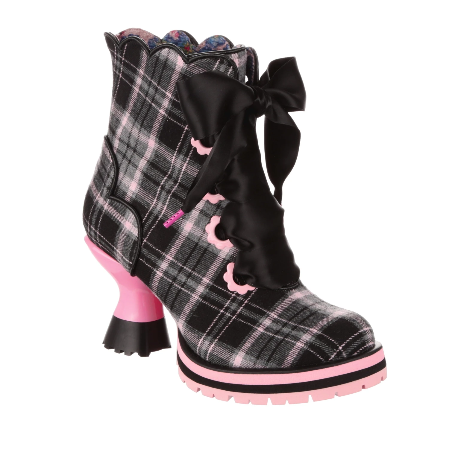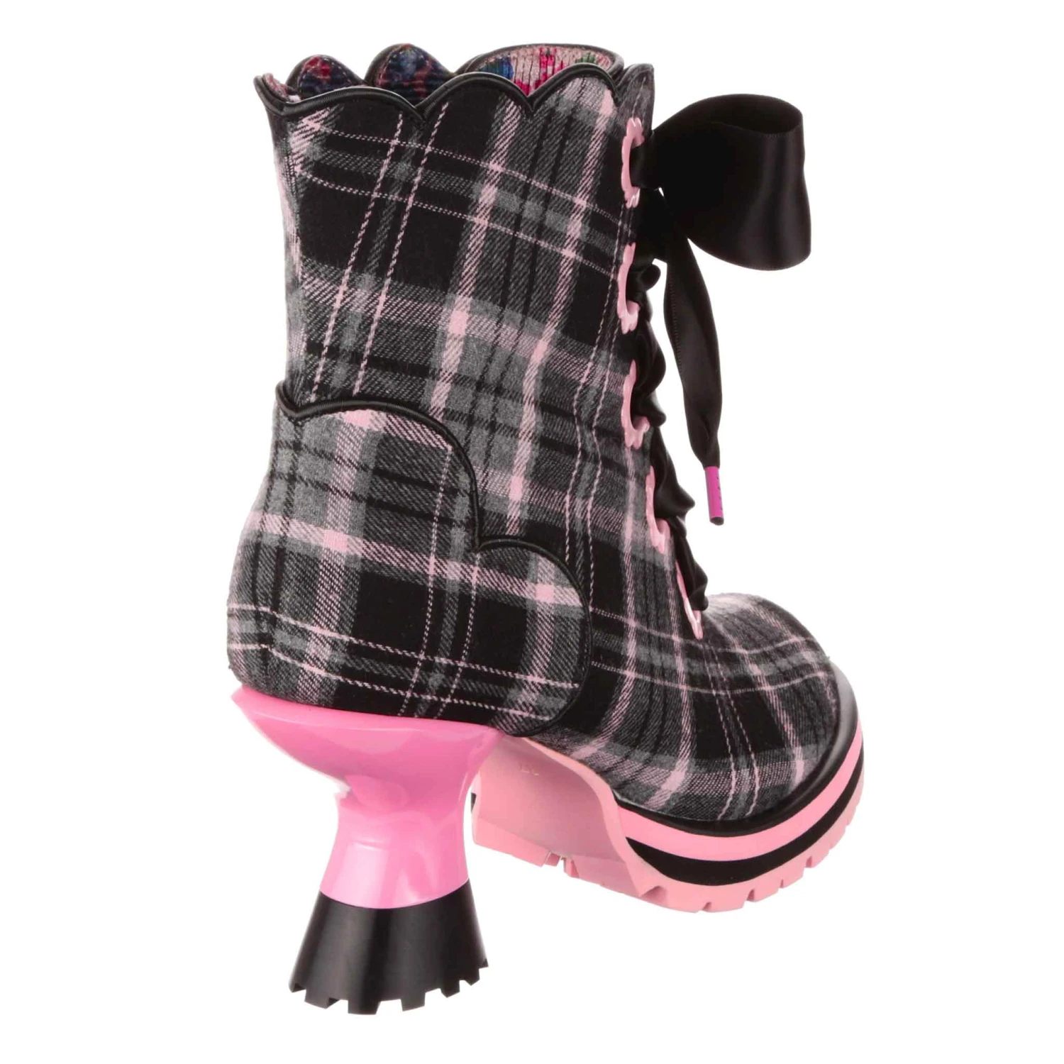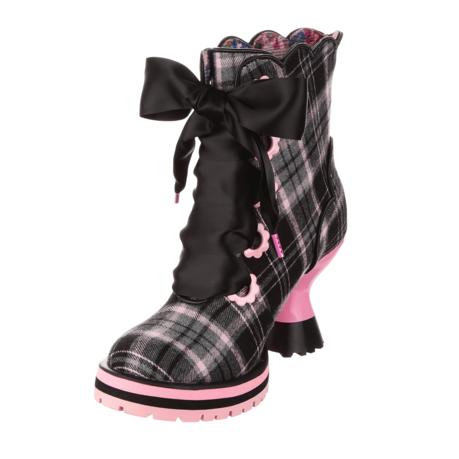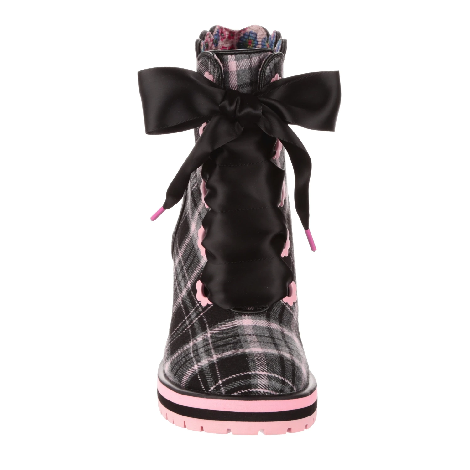 These tartan boots are terrific! Covered from tip to toe in pink and black plaid perfection, they feature a funky flared heel in pink and black, and cute flower shaped eyelets! The chunky platform is layered in matching colours and a thick black satin ribbon ties at the ankle in a perfect bow. Scalloped edges make these shoes a real statement!
