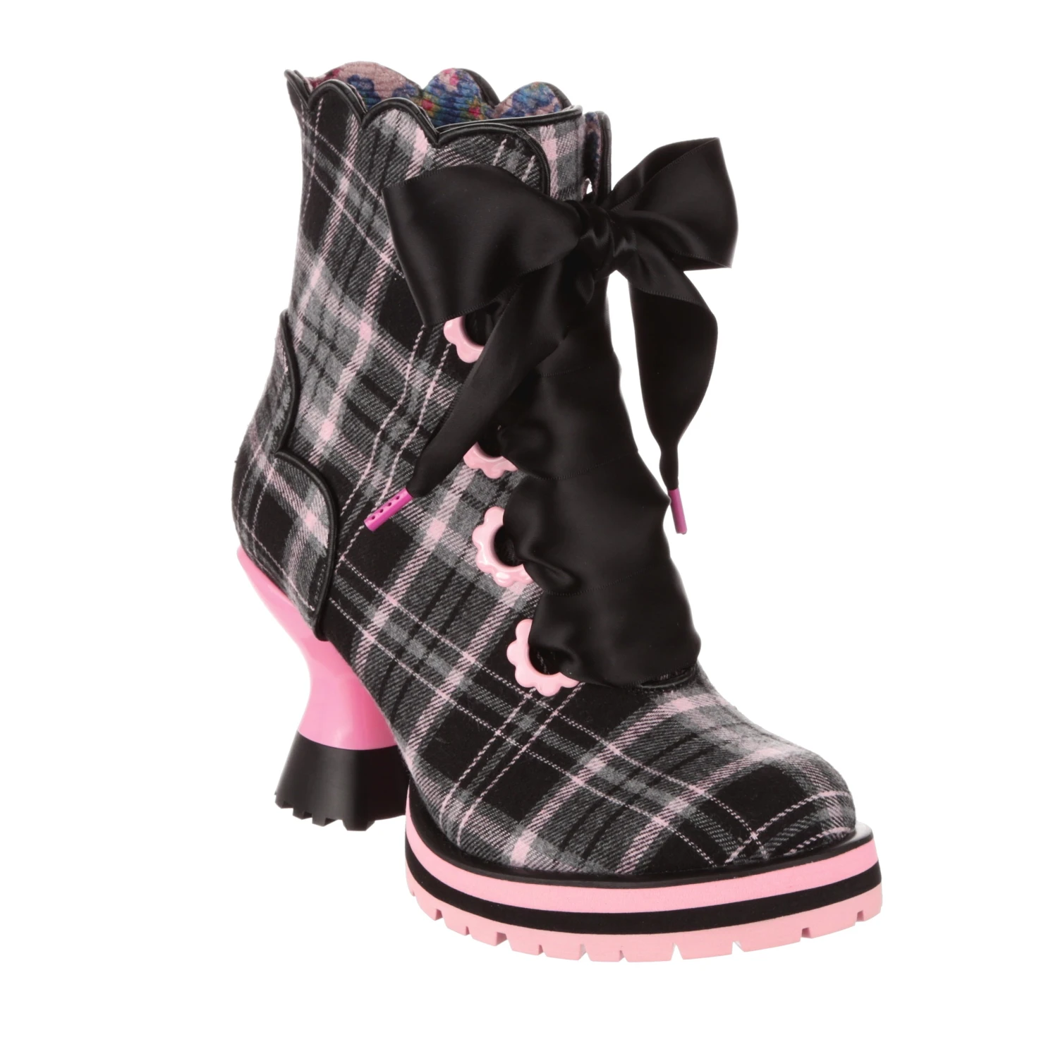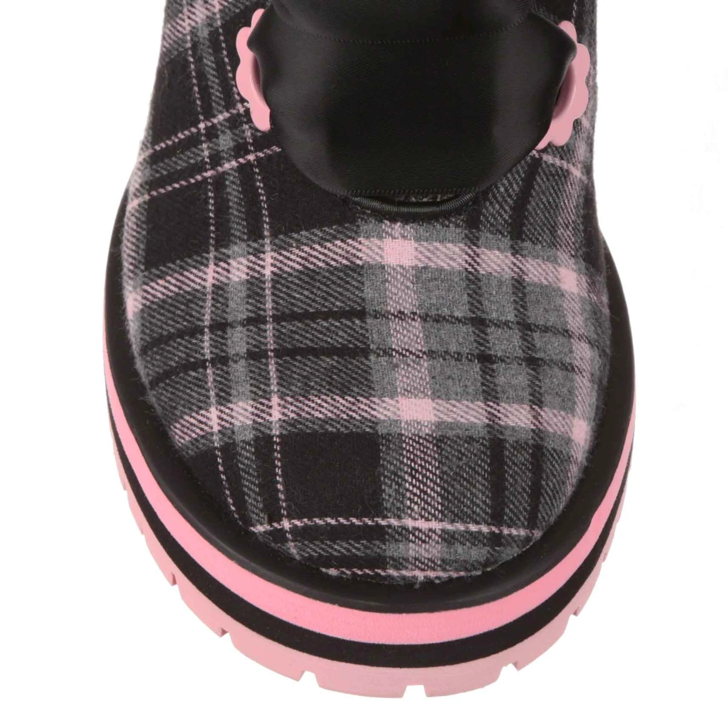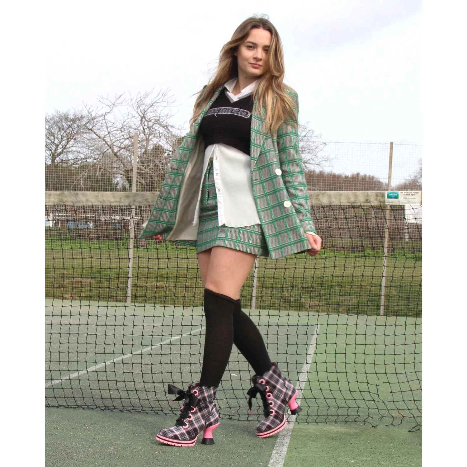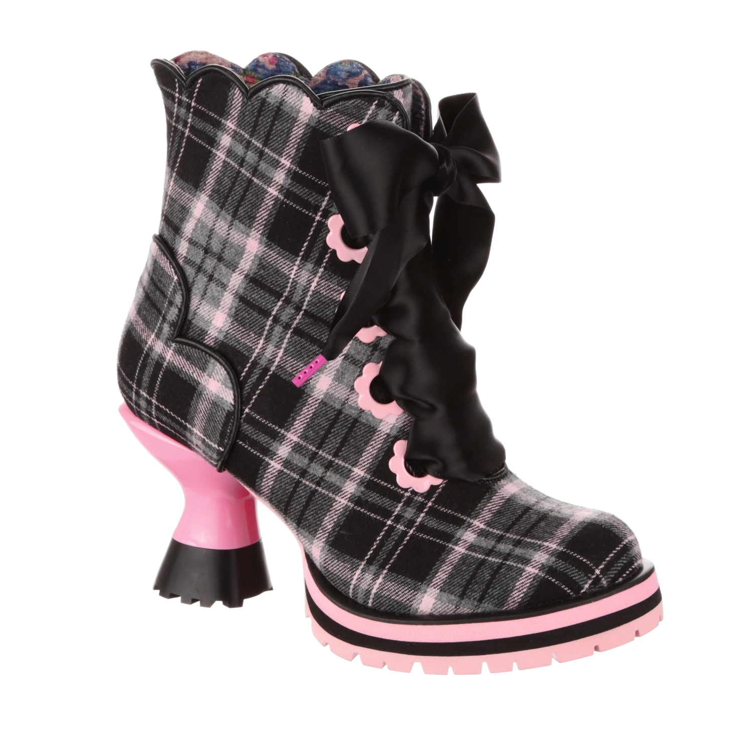 These tartan boots are terrific! Covered from tip to toe in pink and black plaid perfection, they feature a funky flared heel in pink and black, and cute flower shaped eyelets! The chunky platform is layered in matching colours and a thick black satin ribbon ties at the ankle in a perfect bow. Scalloped edges make these shoes a real statement!