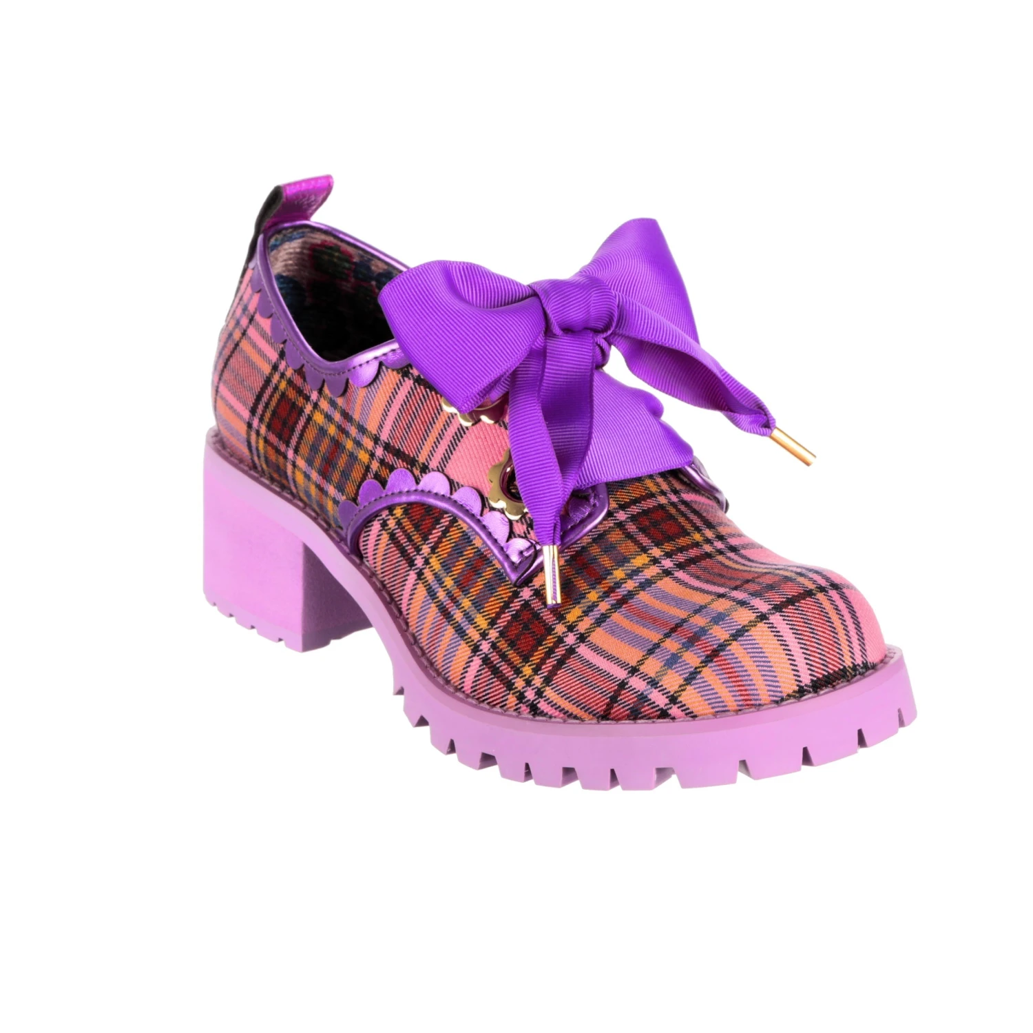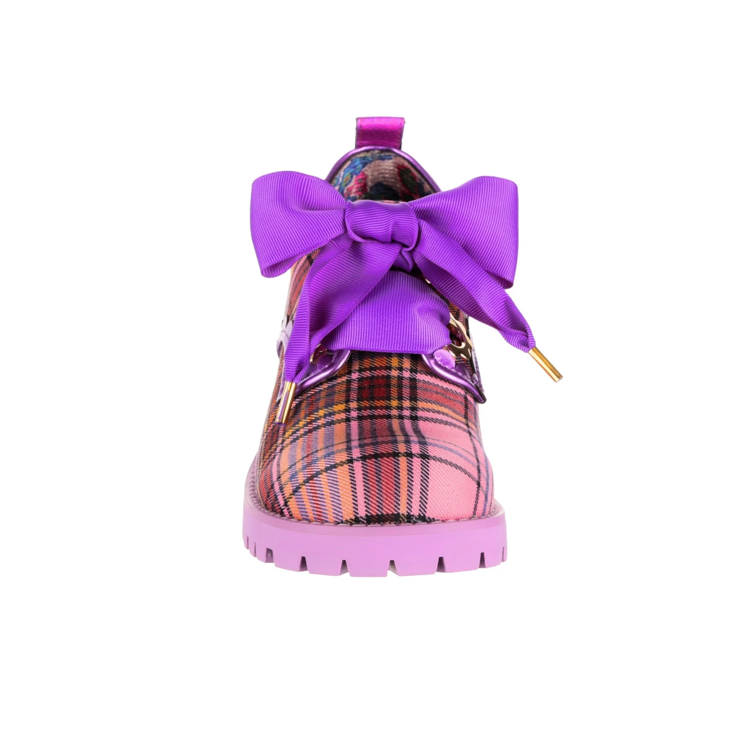 Ring ring! Phew, saved by the bell! Pink and purple tartan is matched with purple ribbon laces and lilac chunky mid heel, add to your wardrobe for a burst of colour. Grab these comfy lace ups to give your outfit a touch of 90’s vibe!