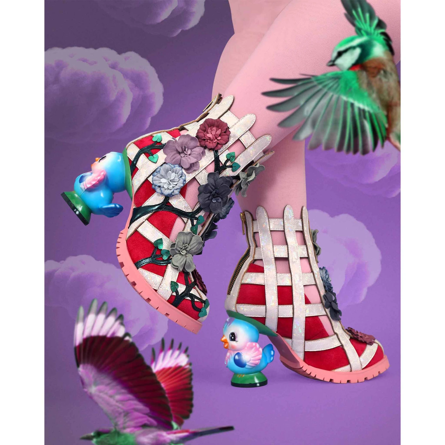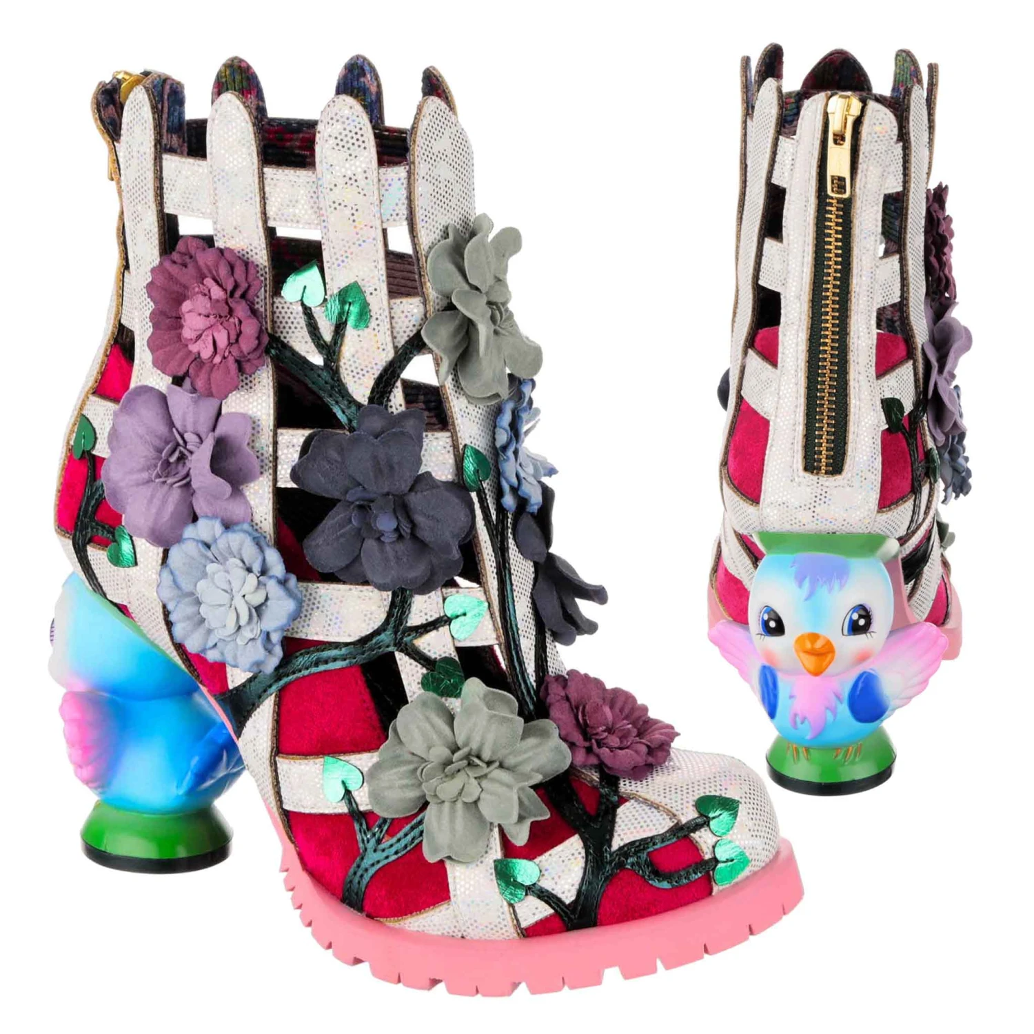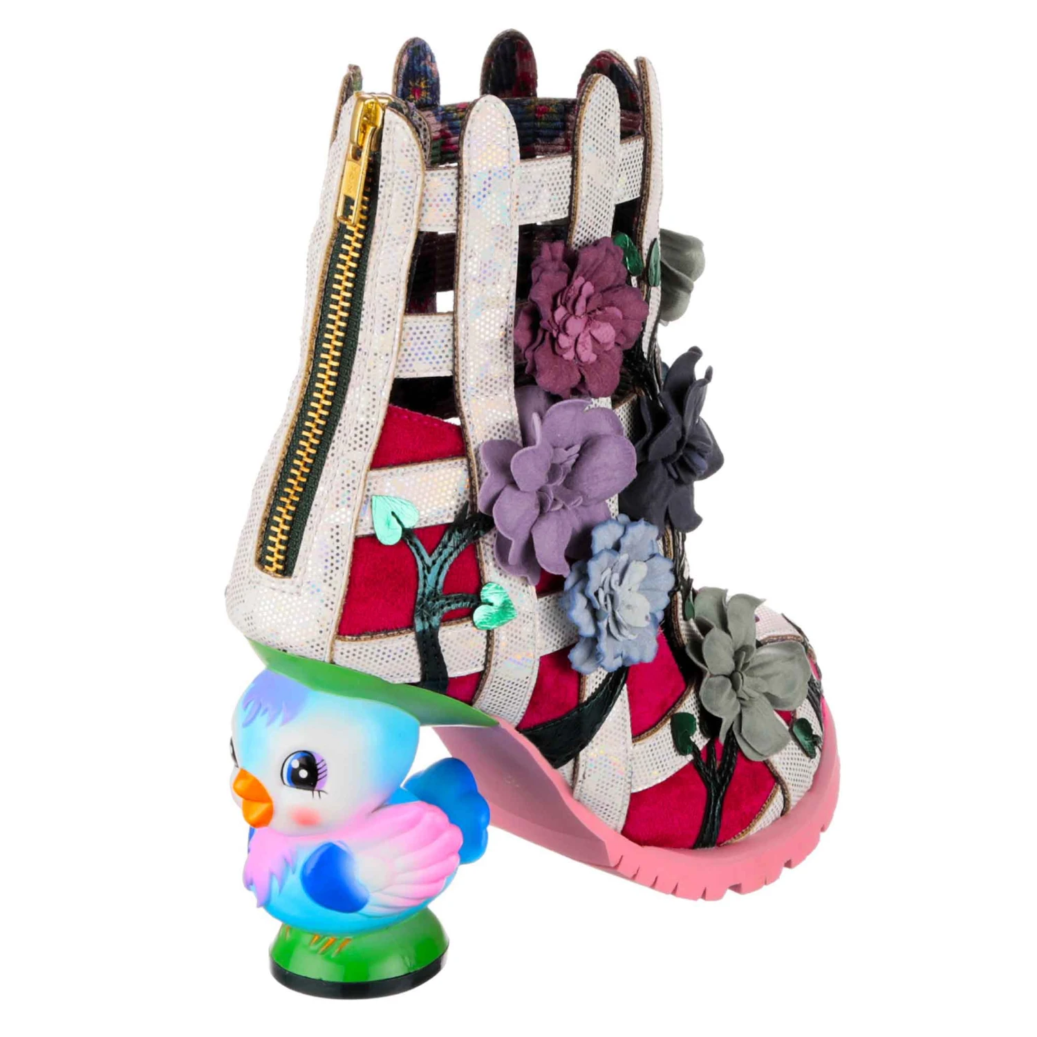 We’ll give you something to chirp about! A lattice fence with creeping vines and 3D flowers enclose your feet in these garden-inspired ankle boots, featuring a kitsch bluebird character heel. A rear zip fastening that makes them easy to slip into, perfect for becoming your go-to showstoppers! Have the vine of your life in these high heel boots!