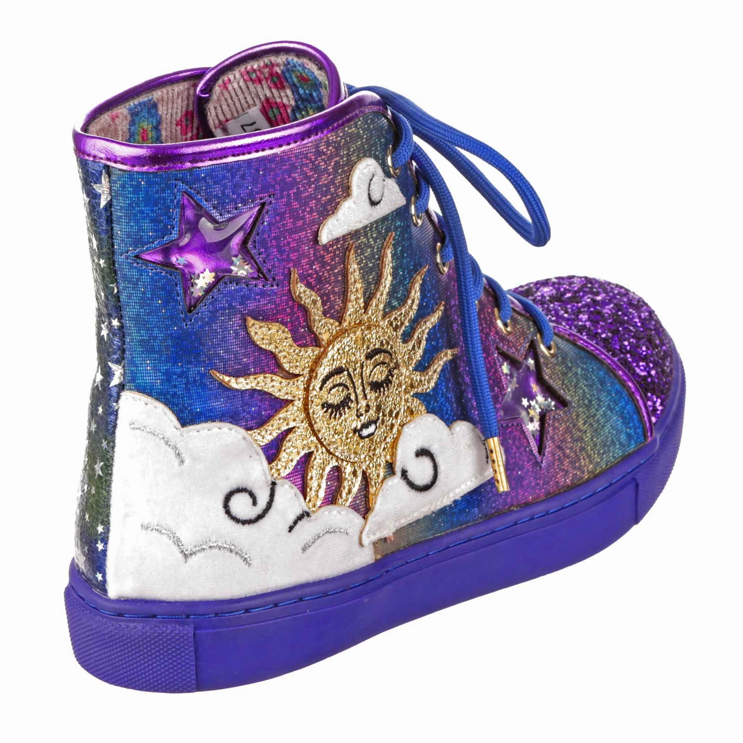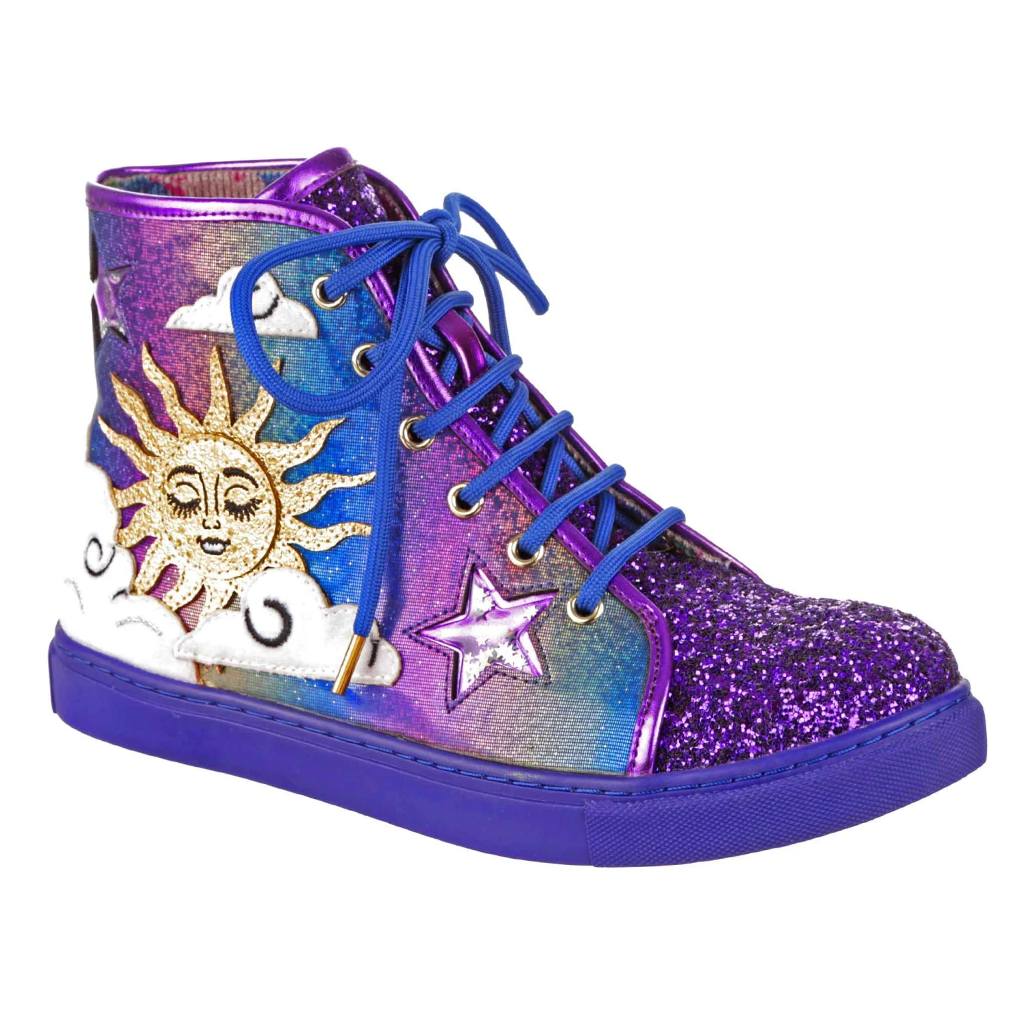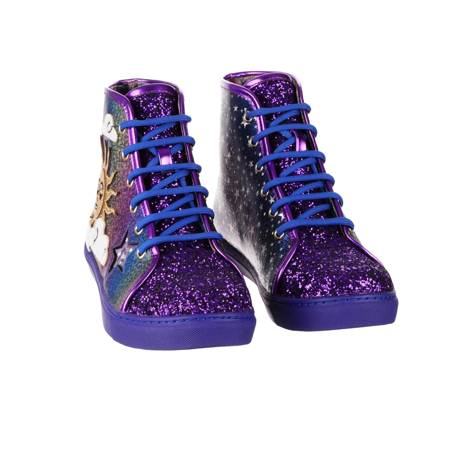 The stars have aligned! Ethereal purples and blues mix with 90’s Sun and Moon trend to create the high top trainers of your dreams! The outside of the shoe has a rainbow iridescent fabric with applique clouds, sun and glow in the dark moon and *throwback alert* gel pouches filled with silver stars that float about. The inside of the shoe is a metallic night sky which is scattered with stars, finished with a purple glitter toe and tongue, purple sole and blue laces.