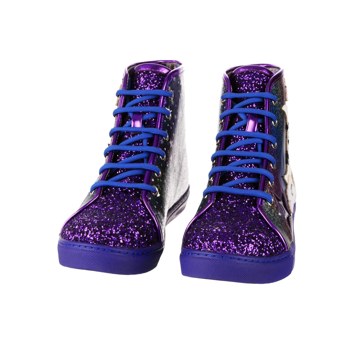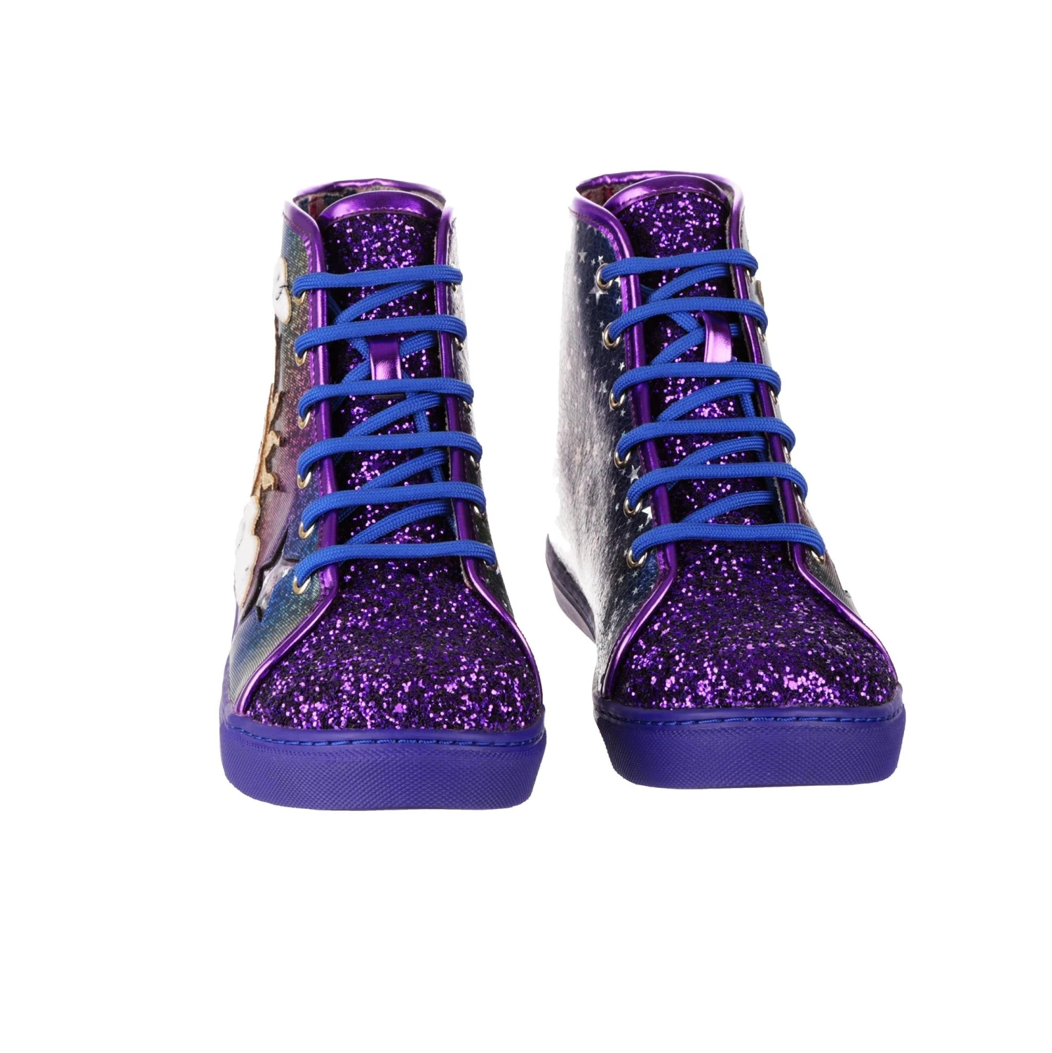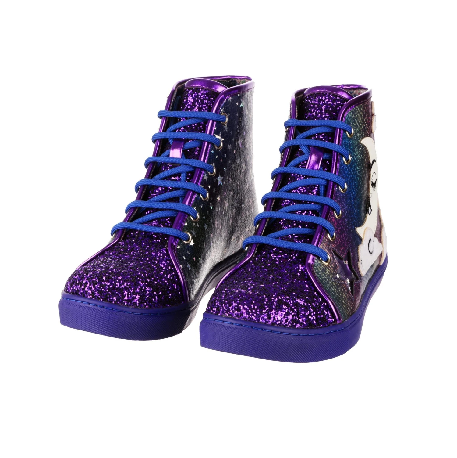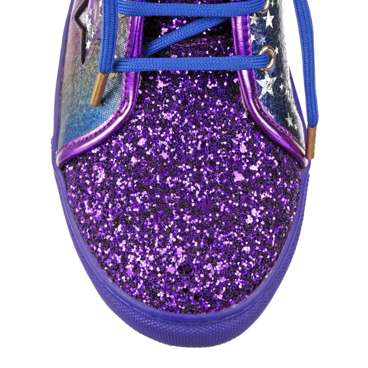 The stars have aligned! Ethereal purples and blues mix with 90’s Sun and Moon trend to create the high top trainers of your dreams! The outside of the shoe has a rainbow iridescent fabric with applique clouds, sun and glow in the dark moon and *throwback alert* gel pouches filled with silver stars that float about. The inside of the shoe is a metallic night sky which is scattered with stars, finished with a purple glitter toe and tongue, purple sole and blue laces.