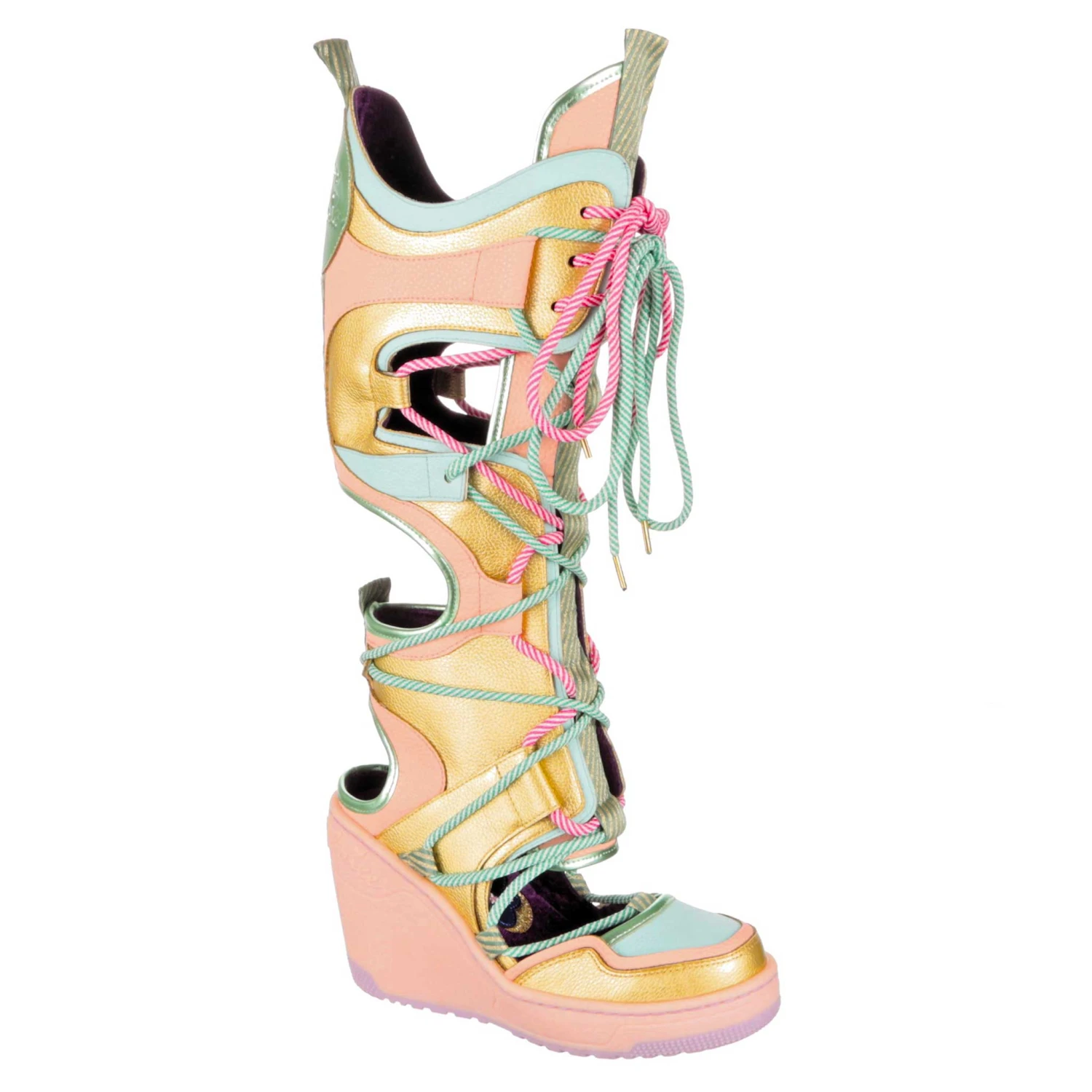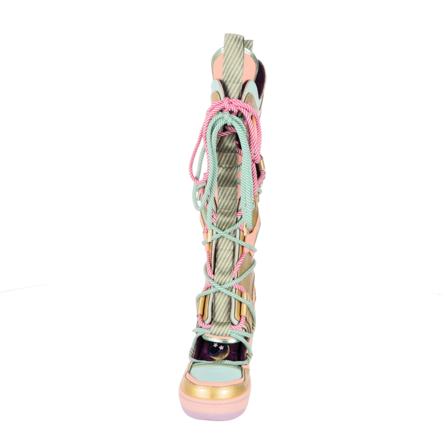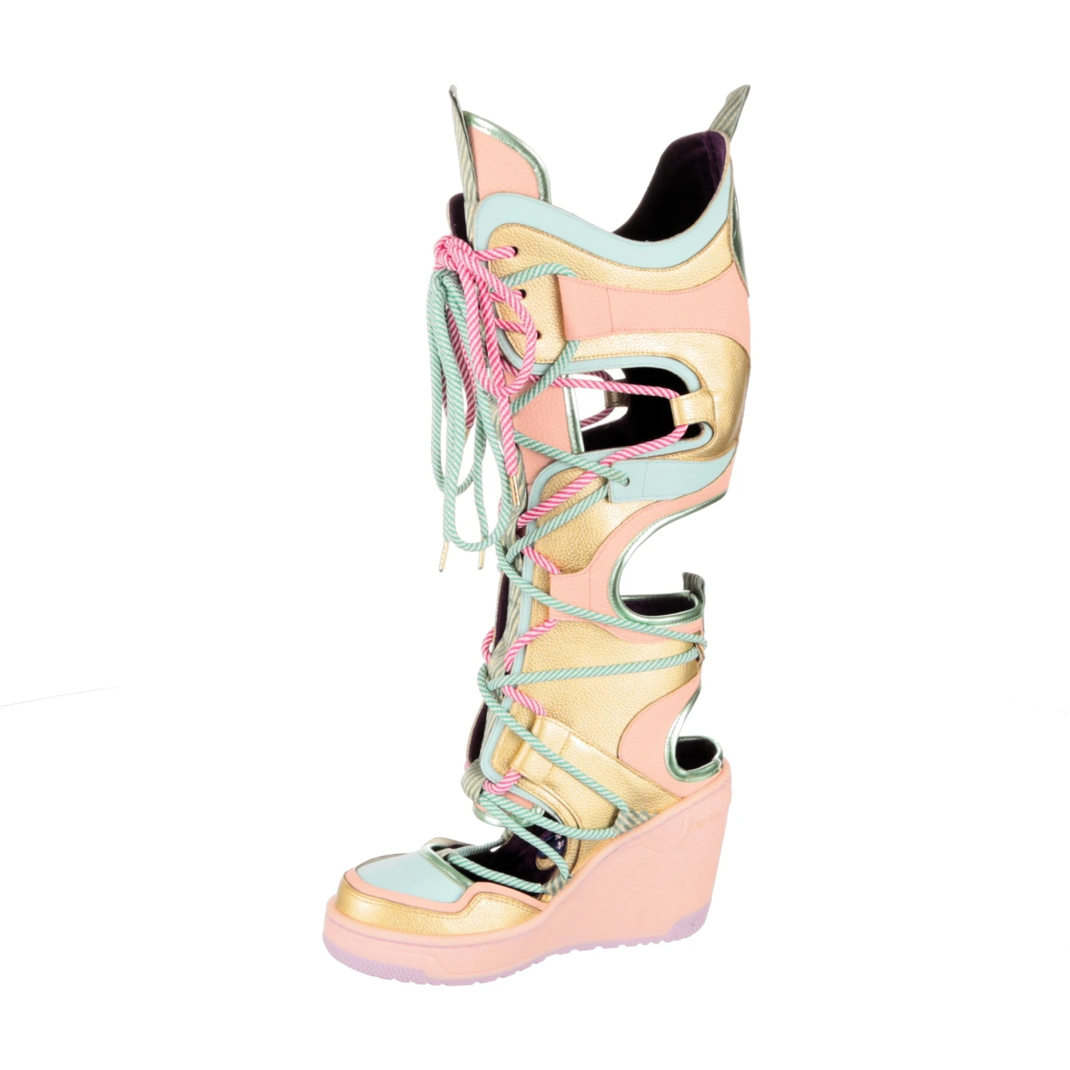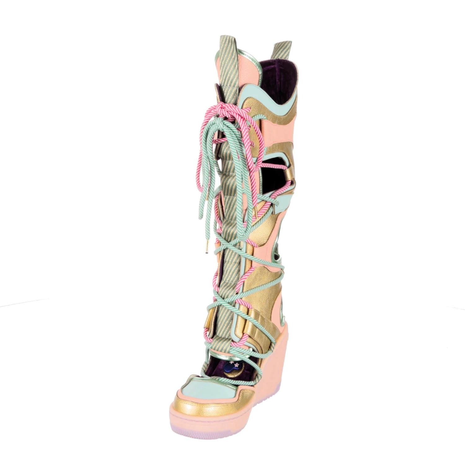These sporty shoes are out of this world! Knee high, covered with laces and straps, and featuring a pink chunky wedge heel! Cutouts on the shoe are criss-crossed with pink and green laces, secured with tabs in the metallic gold upper. Pink and blue accents contrast the gold, and match the candy-striped laces. Metallic mint green piping ties the whole look together.