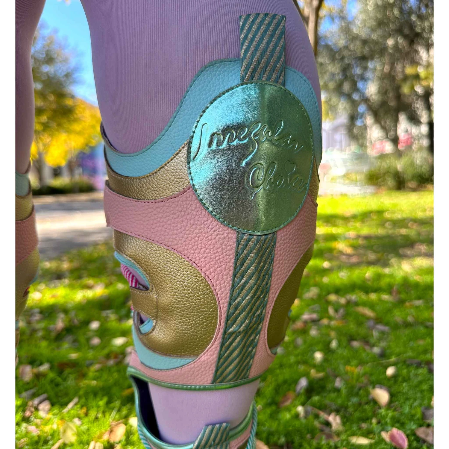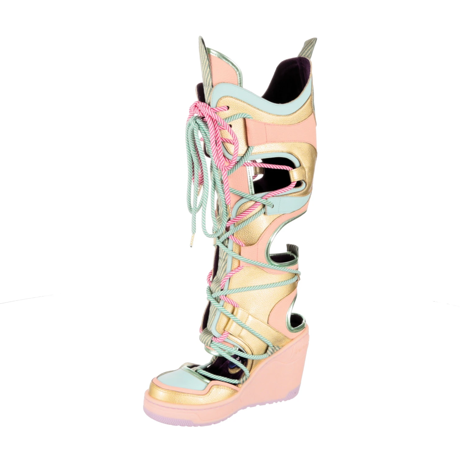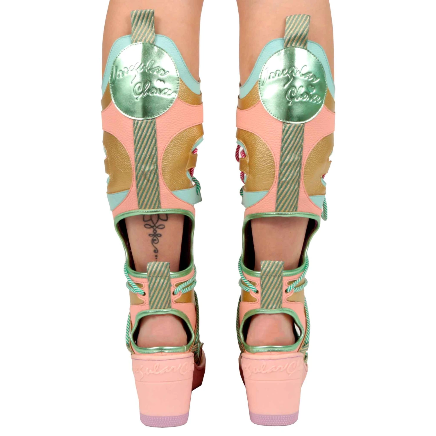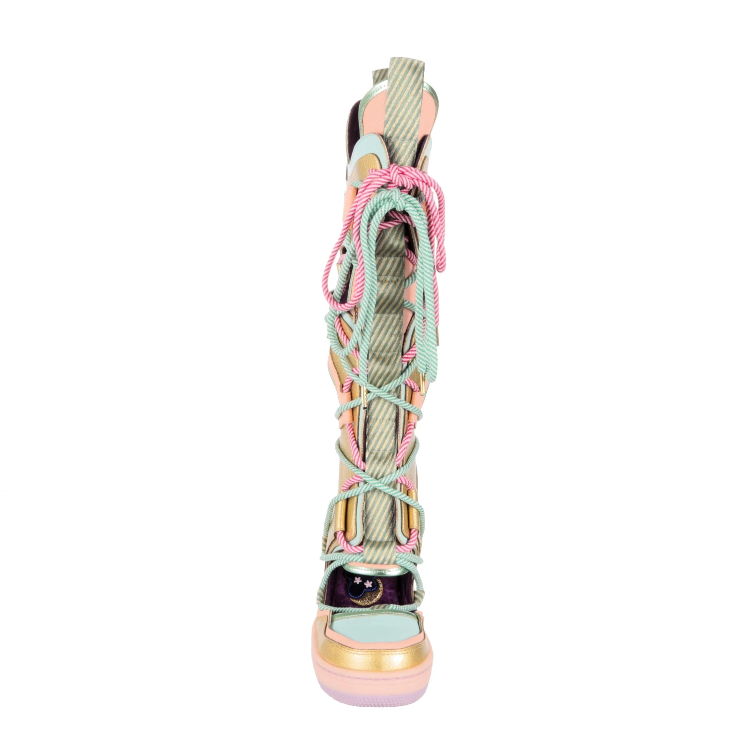These sporty shoes are out of this world! Knee high, covered with laces and straps, and featuring a pink chunky wedge heel! Cutouts on the shoe are criss-crossed with pink and green laces, secured with tabs in the metallic gold upper. Pink and blue accents contrast the gold, and match the candy-striped laces. Metallic mint green piping ties the whole look together.