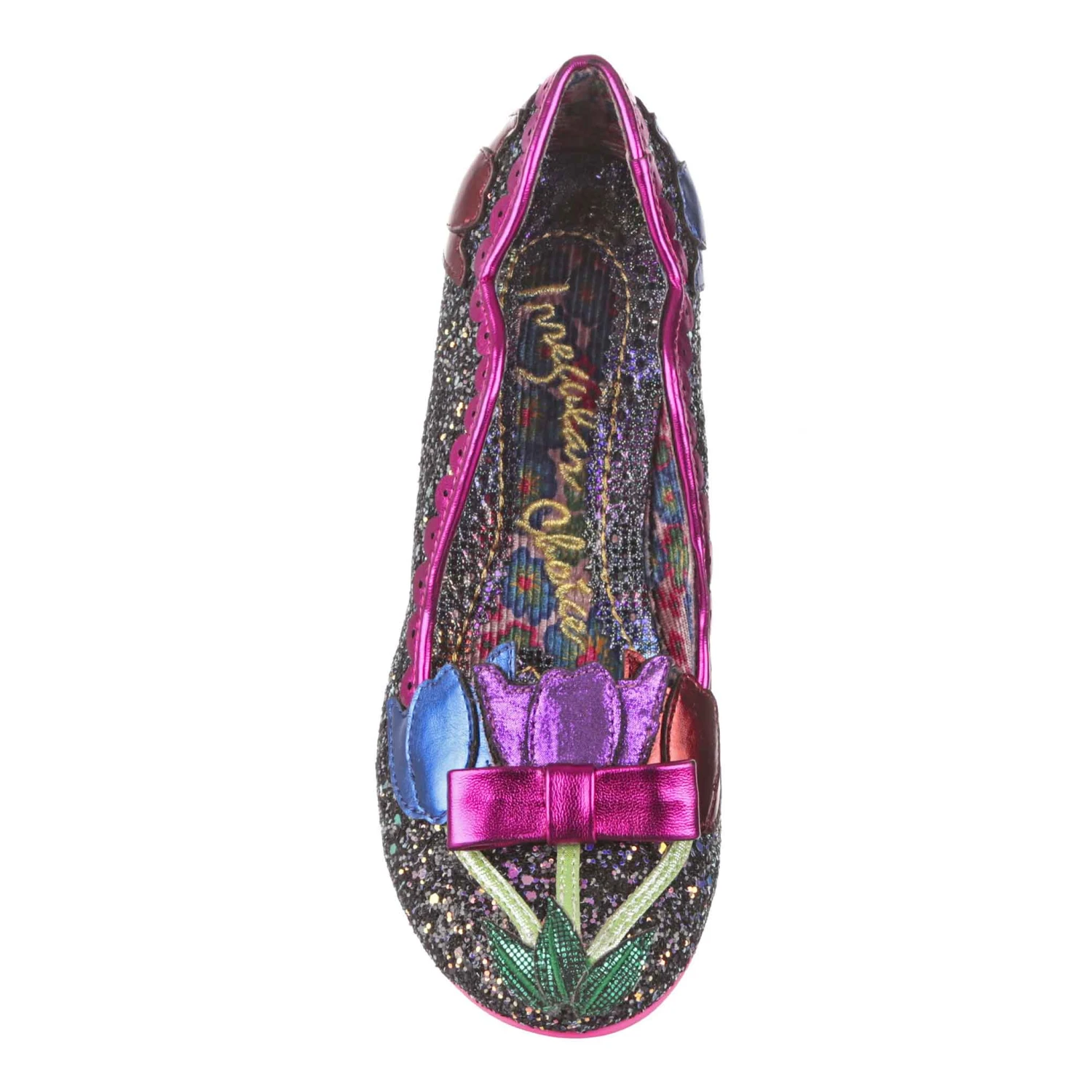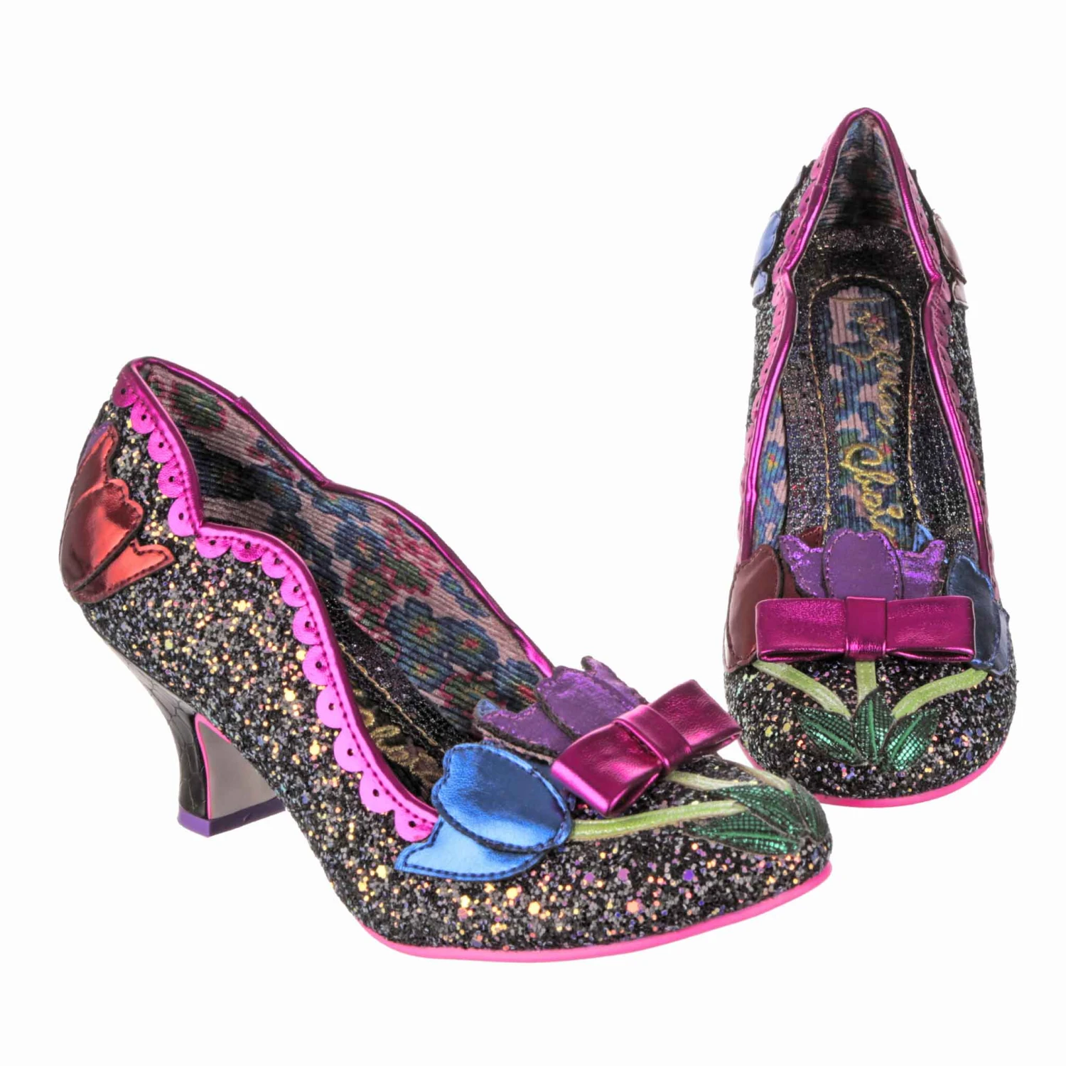 These petalled pumps are as dainty as a daisy! Covered from tip to toe in chunky black iridescent glitter, they feature beautiful applique tulips in various shades of metallic patent. Intricate metallic hot pink trim and piping surrounds the shoe, and the short heel is covered in shiny faux-croc. A cute hot pink metallic patent bow on the toe is the cherry on top!