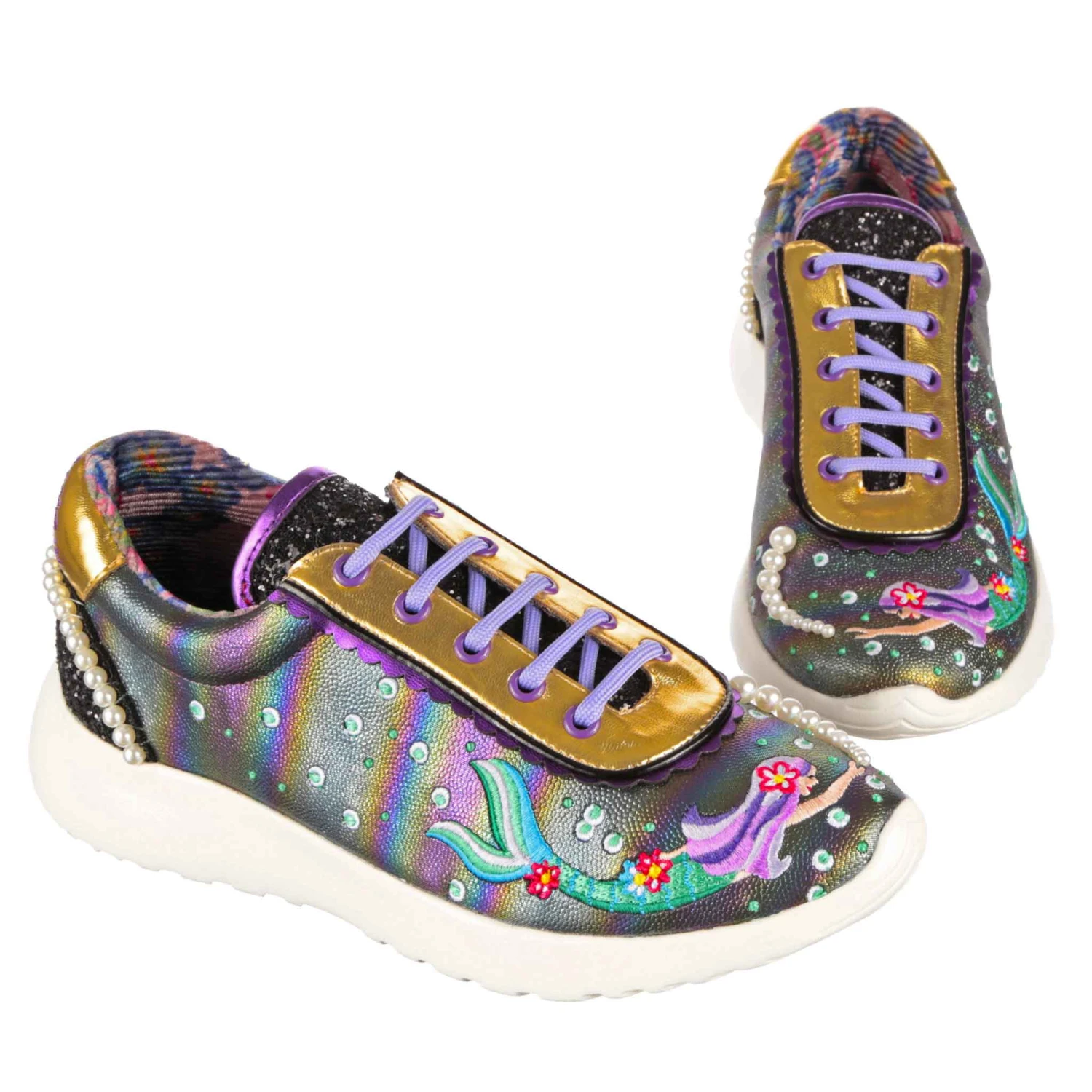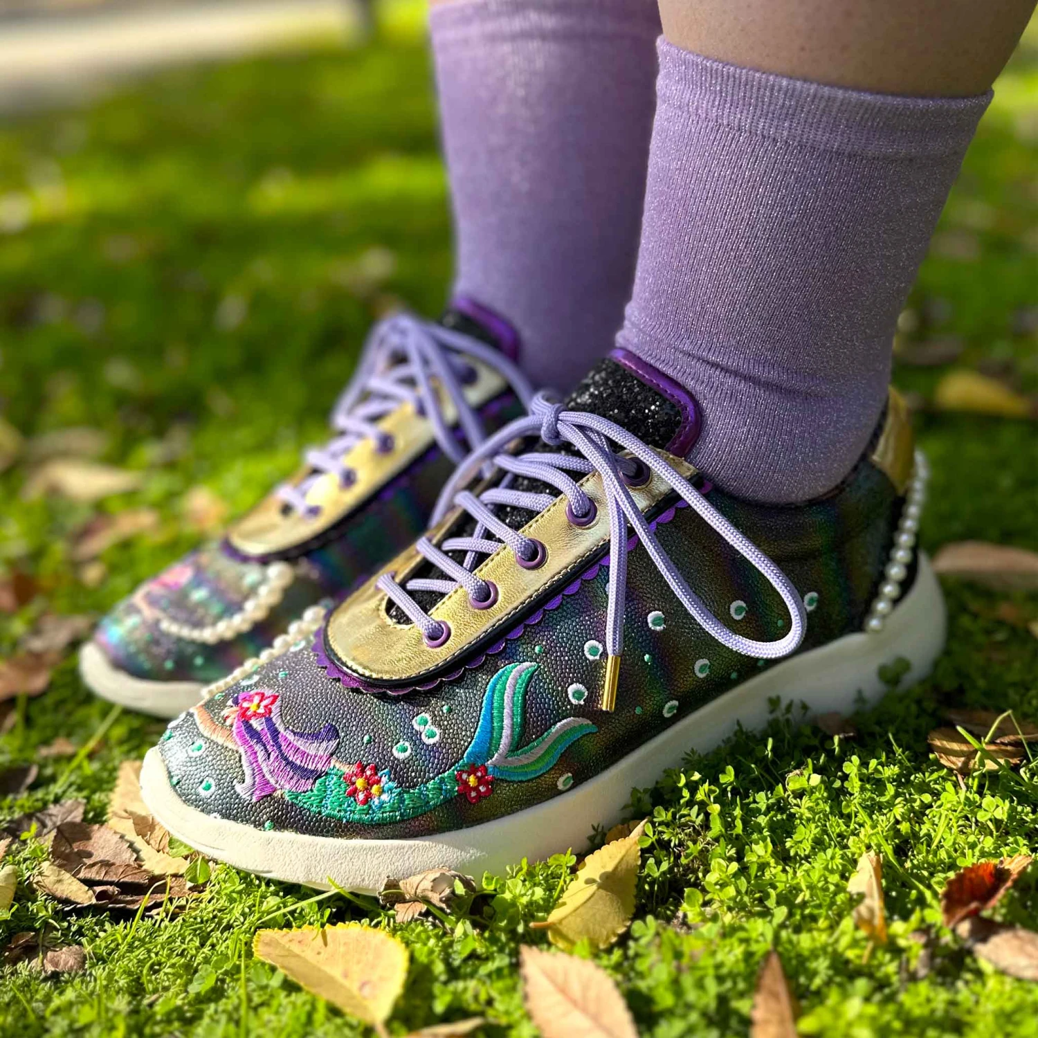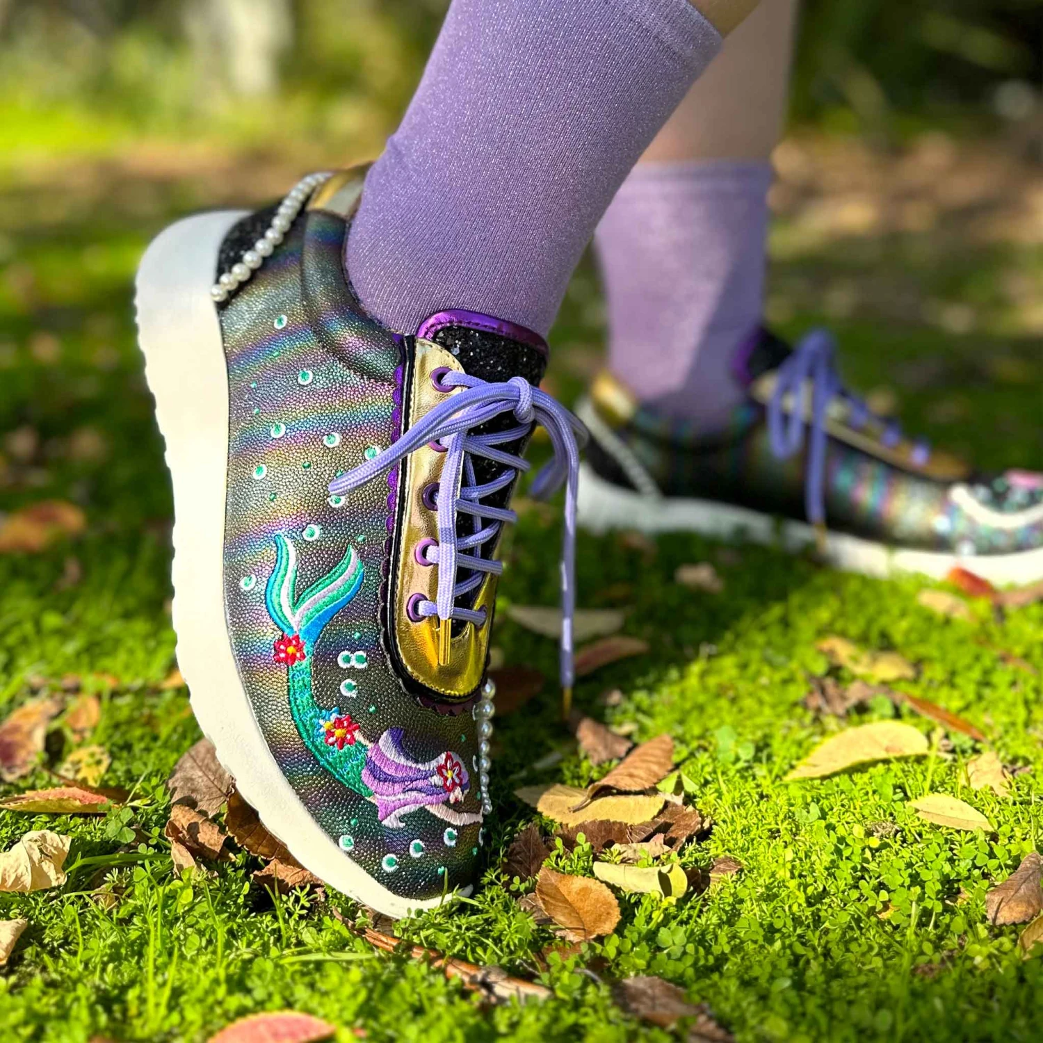 These fabulous mermaid trainers will get you ready to be a queen of the seas! Whether you are riding waves in a clamshell bra, or just needing the perfect accessory for your new pair of legs, these are the perfect choice for you! Decked out in pearly beads and mermazing embroidery on a black iridescent fabric, with splashes of glitter on a comfy soft lightweight sole.