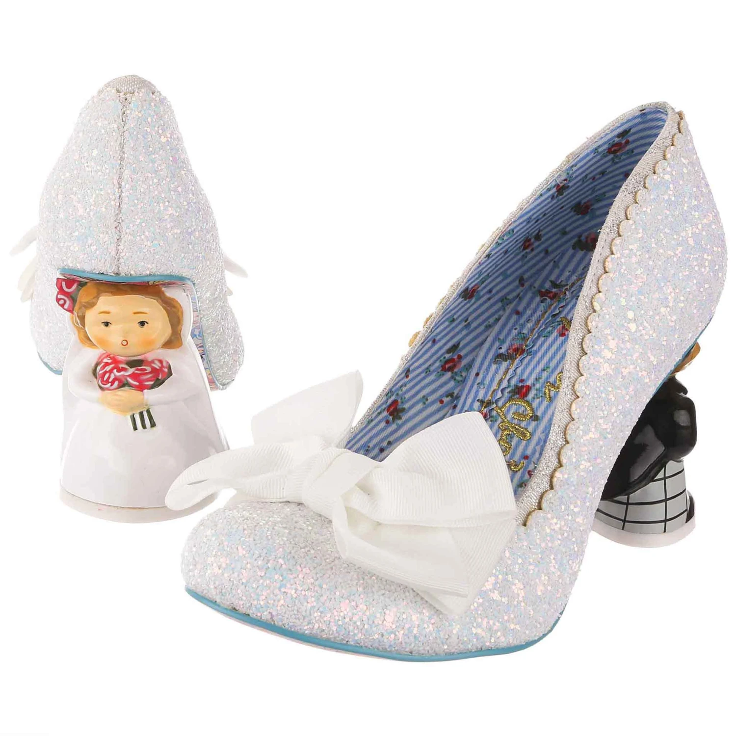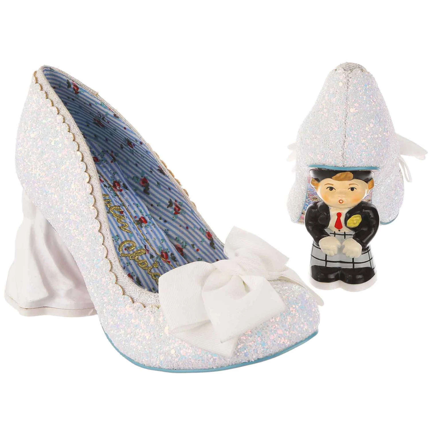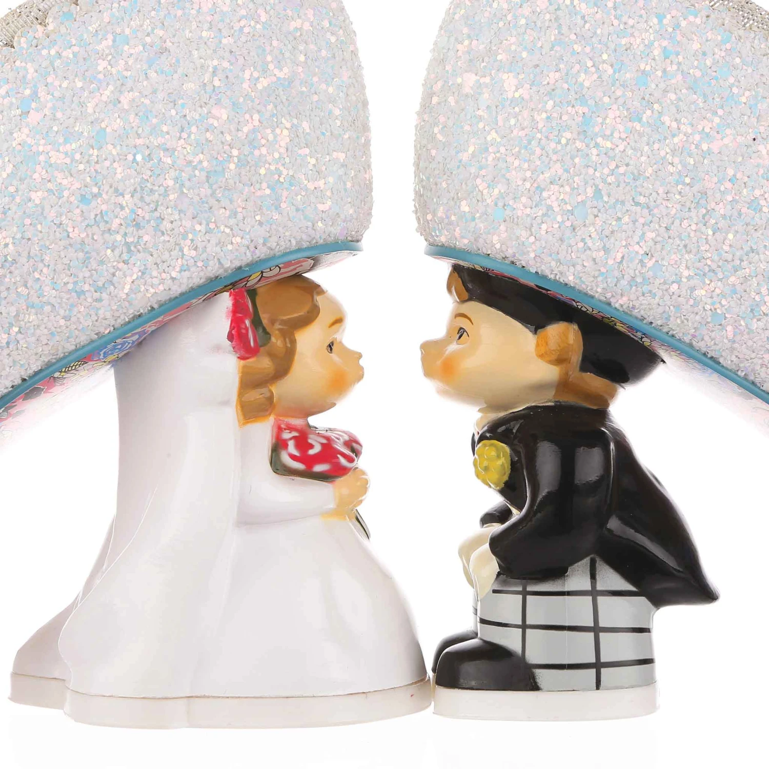 For the Mr and Mrs to be! Sparkle and shine on your special wedding day with these iridescent white glitter encrusted high heels, finished with a white grosgrain ribbon bow on the toe. The kissing bride and groom concept heels turn these wedding shoes into wedding showstoppers! Discover your perfect bridal shoes and get these now!