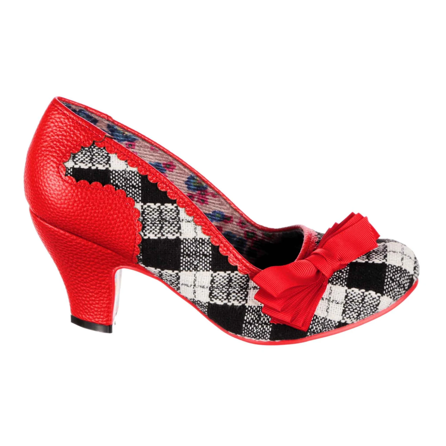 Put some prep in your step with these check mid heels! A woven black and white check with a hint of glitter is contrasted with the red heel, scalloped edging and matching side bow, they will take you from work to play in the click of your heels!