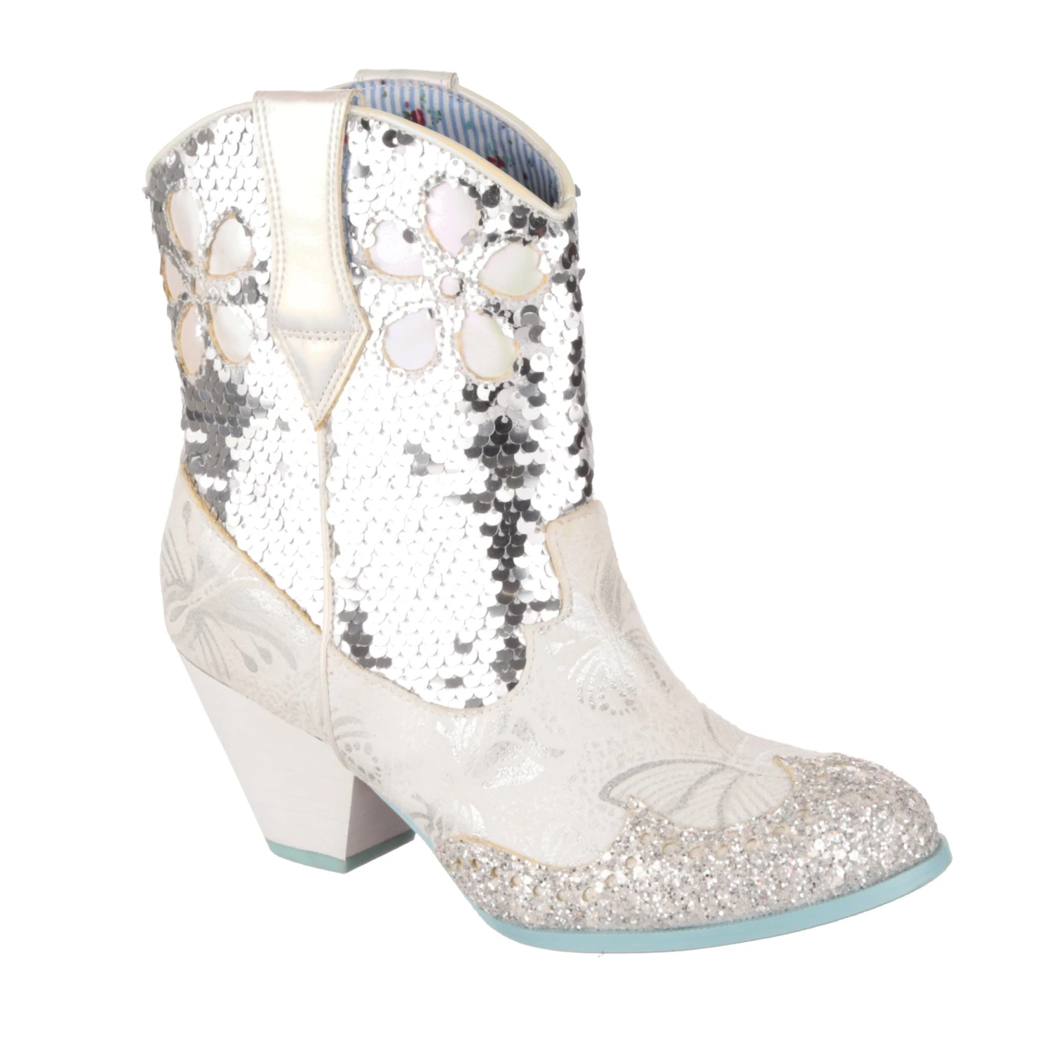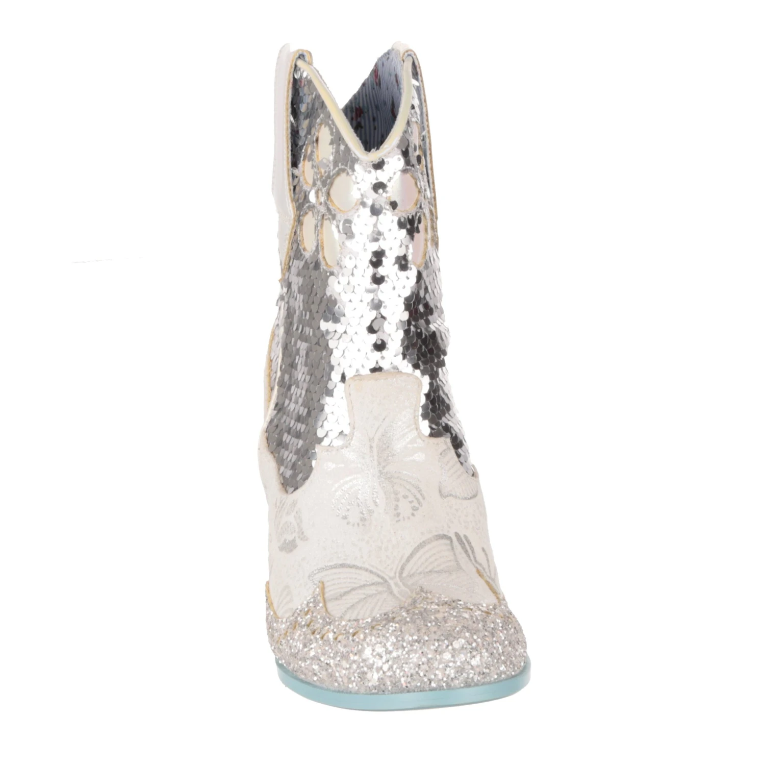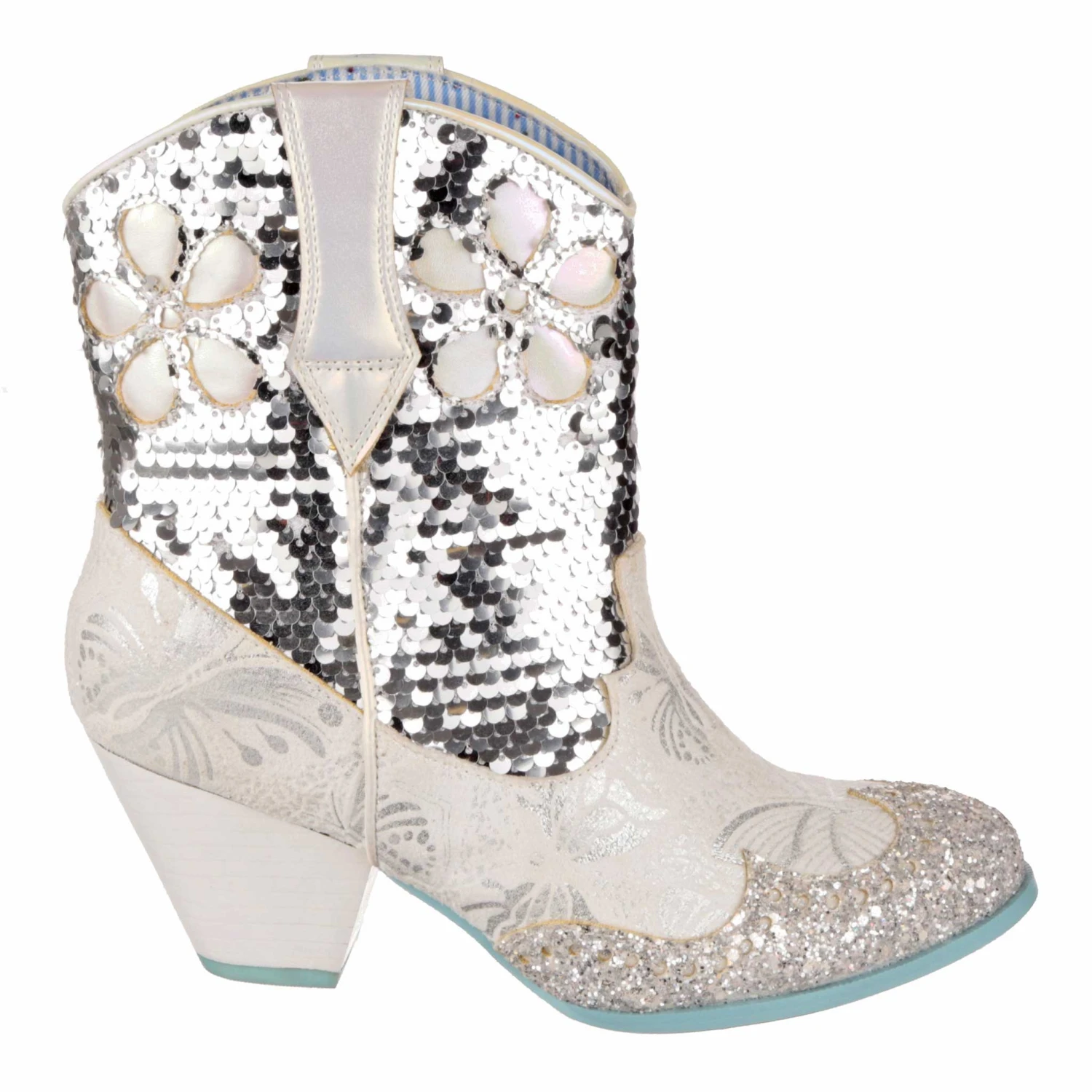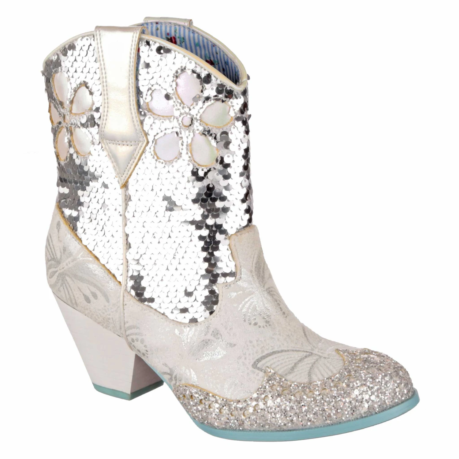 Planning a wedding hoedown? Then giddy up partner and grab a pair of our sparkly white and silver bridal cowboy boots that’ll definitely bring the party to your big day. Calf length boots covered in a mix of silver sequins, glitter and butterfly print, these cuban heeled beauties will have you bootscooting your way down the aisle and into the night. Pull on using the handy tabs and this cowgirl is ready to be wed!
