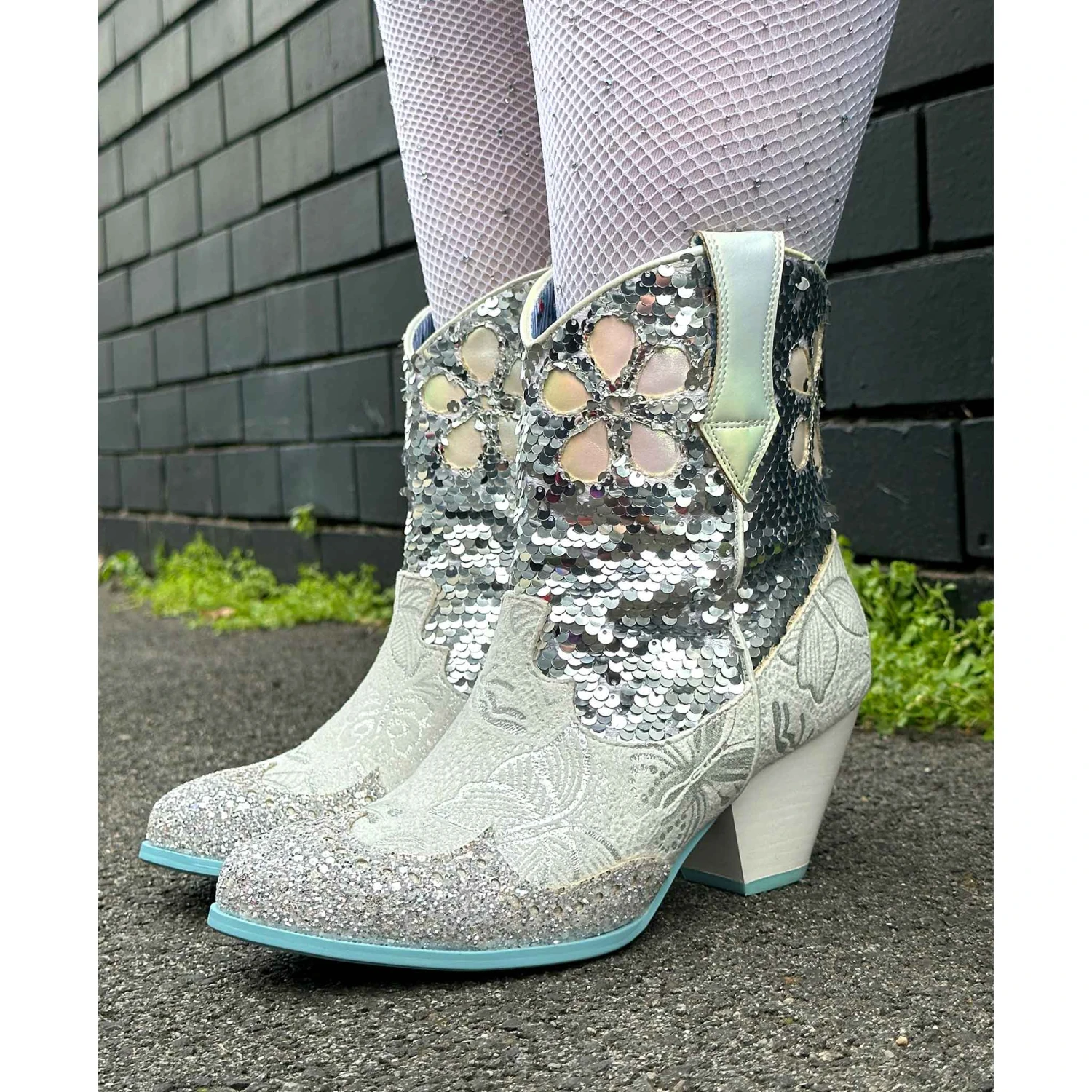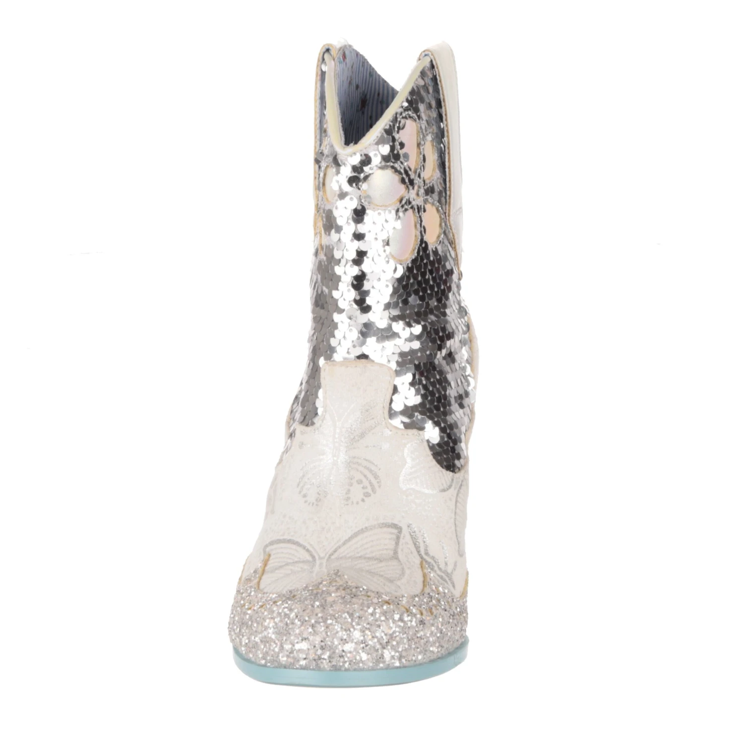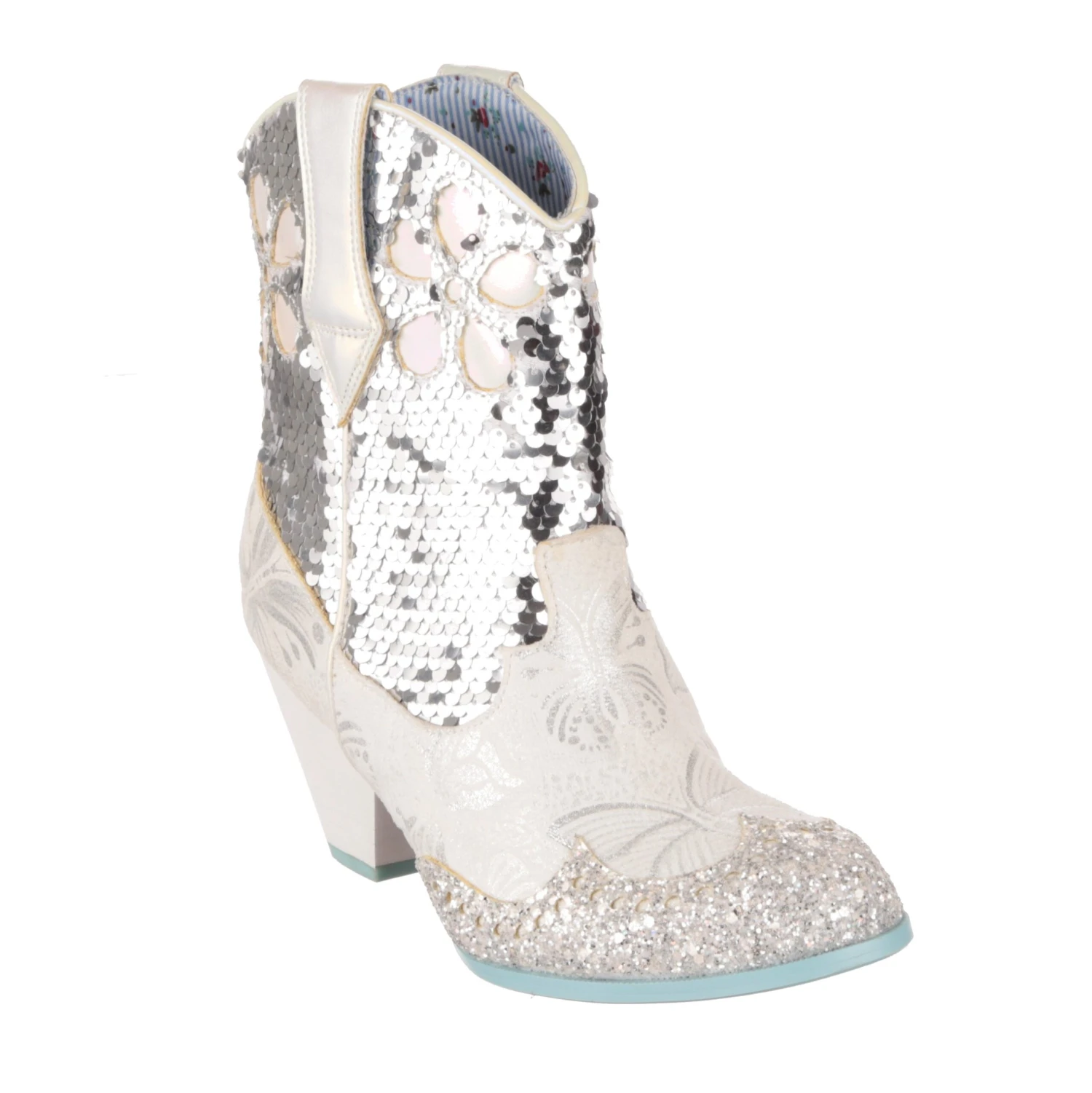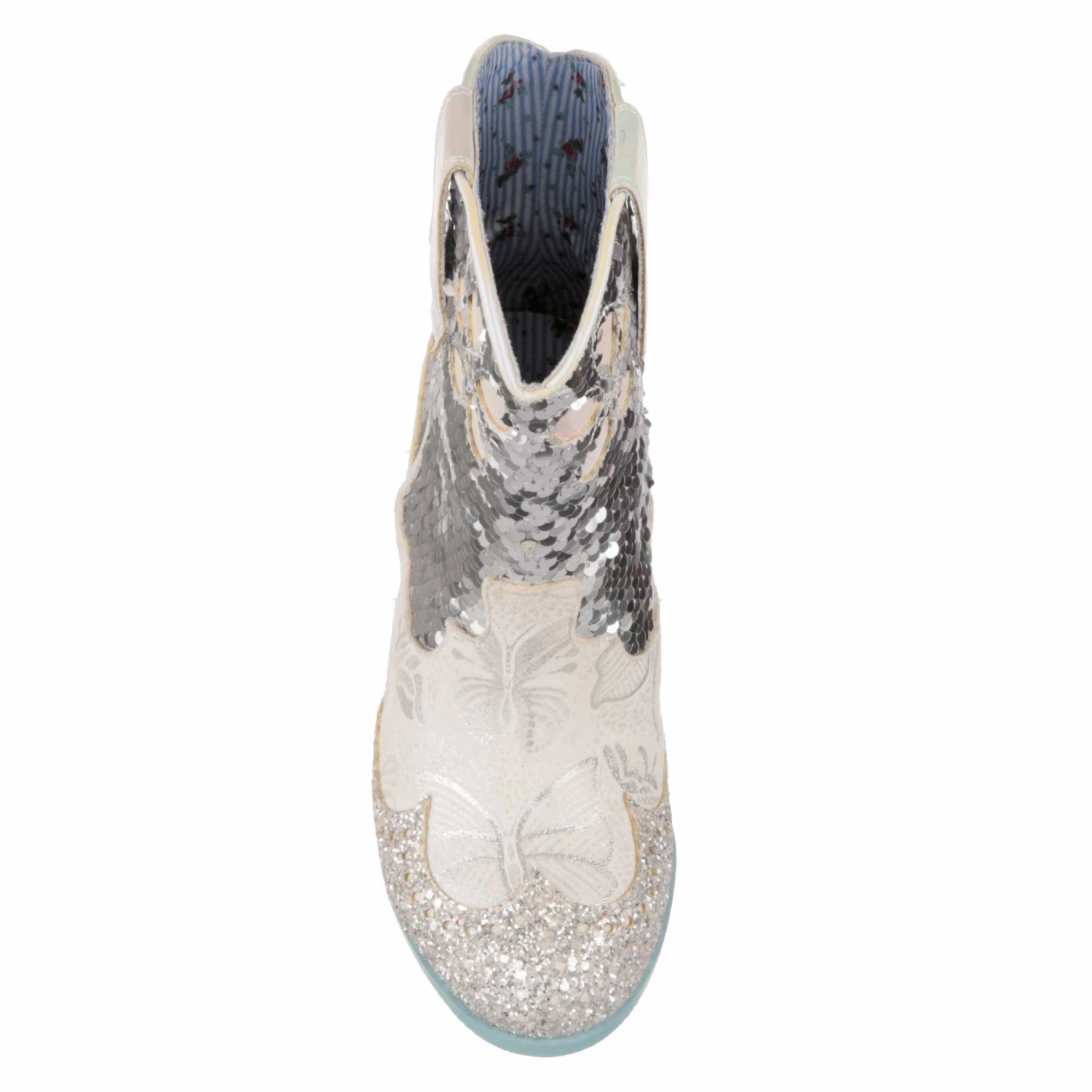 Planning a wedding hoedown? Then giddy up partner and grab a pair of our sparkly white and silver bridal cowboy boots that’ll definitely bring the party to your big day. Calf length boots covered in a mix of silver sequins, glitter and butterfly print, these cuban heeled beauties will have you bootscooting your way down the aisle and into the night. Pull on using the handy tabs and this cowgirl is ready to be wed!
