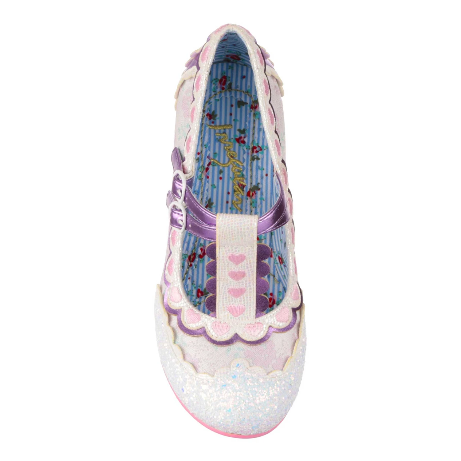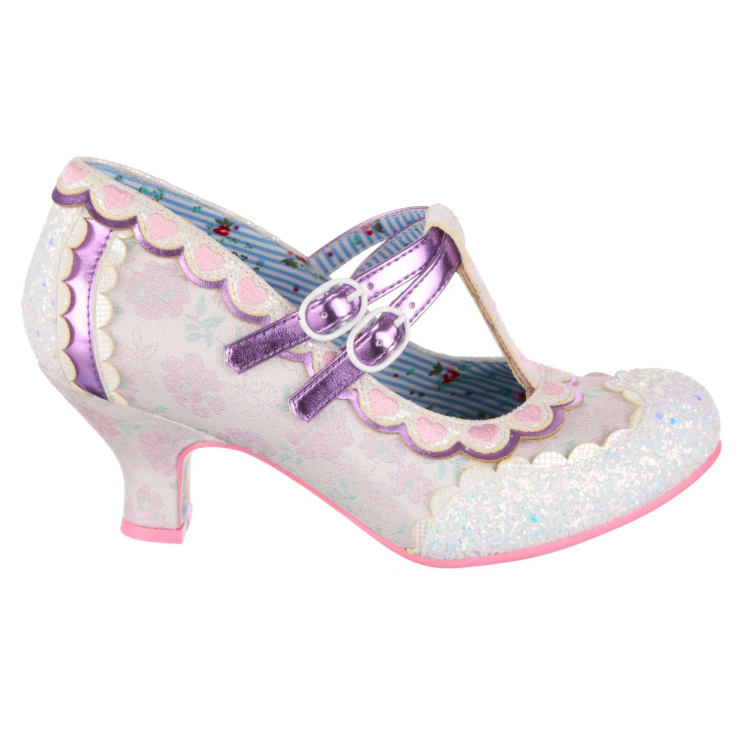 Aren’t these the icing on the wedding cake?! Whether you’re the bride or the bridesmaid, everyone will want to buckle themselves into these wedding mid heels. Pinks and purples are complimented with a delicate floral fabric base, white iridescent glitter toe and a t-bar with double ankle strap makes sure they stay secure all day and night. Scalloped edges and pink embroidered hearts finish off the sweetest wedding mid heels there ever were!