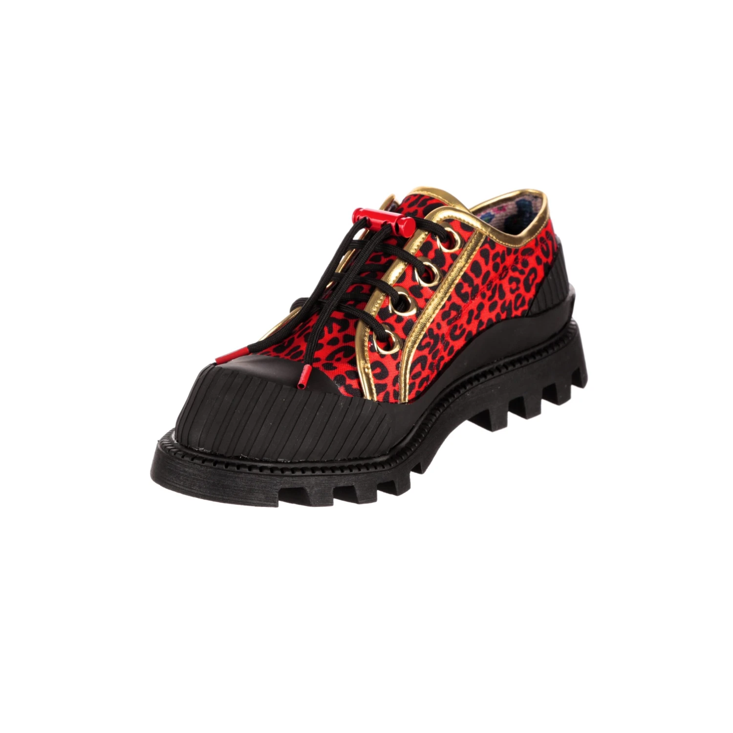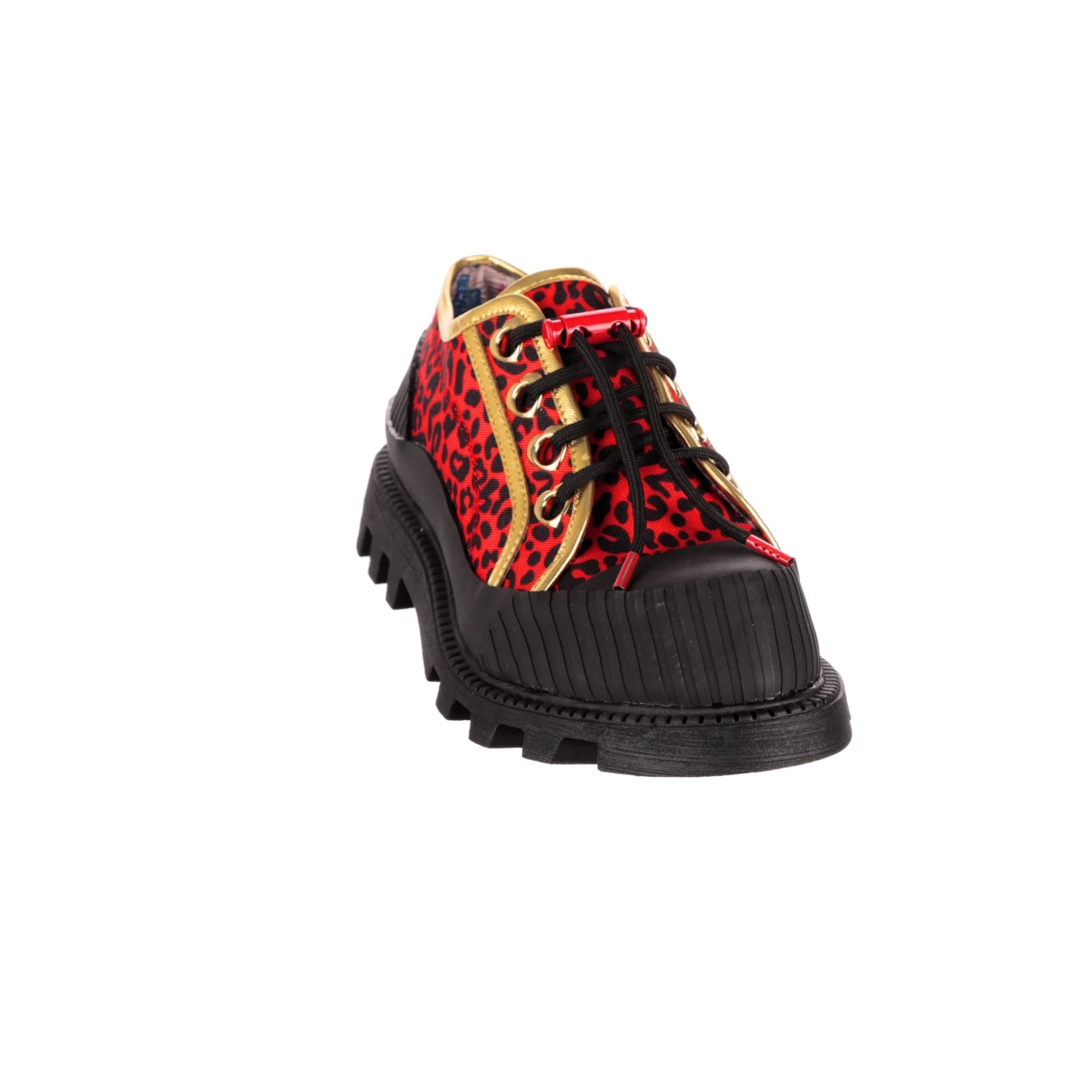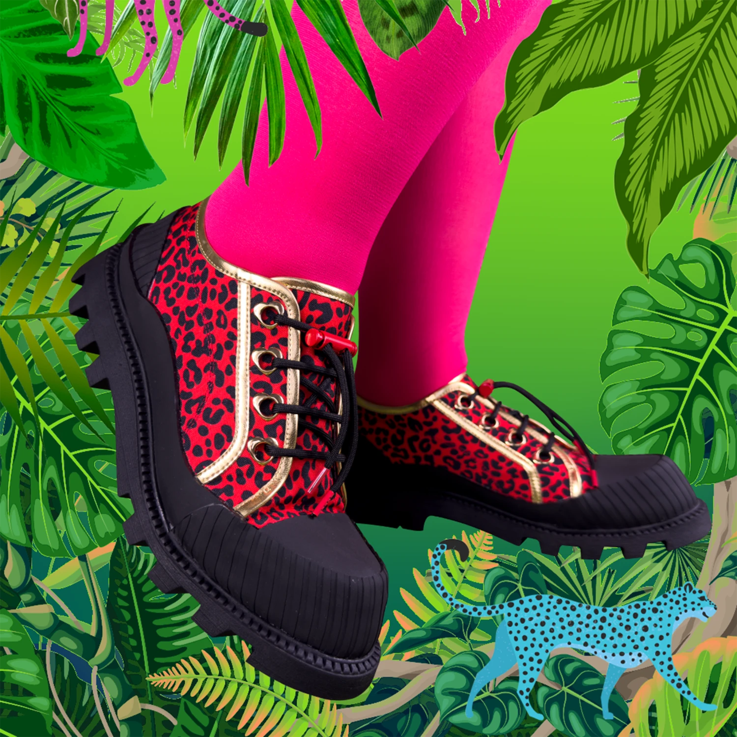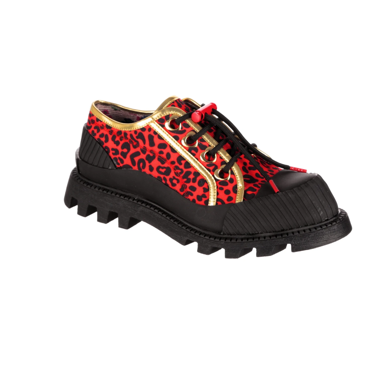Who’s got time for laces? Simply tighten the toggle on this Iconic statement style with black deep tread and bright red leopard print canvas that you won’t want to take off! Rock on with these chunky flats that’ll make you feel super cool!