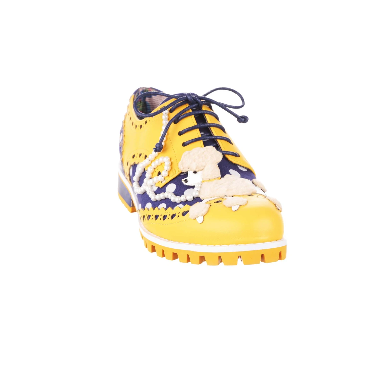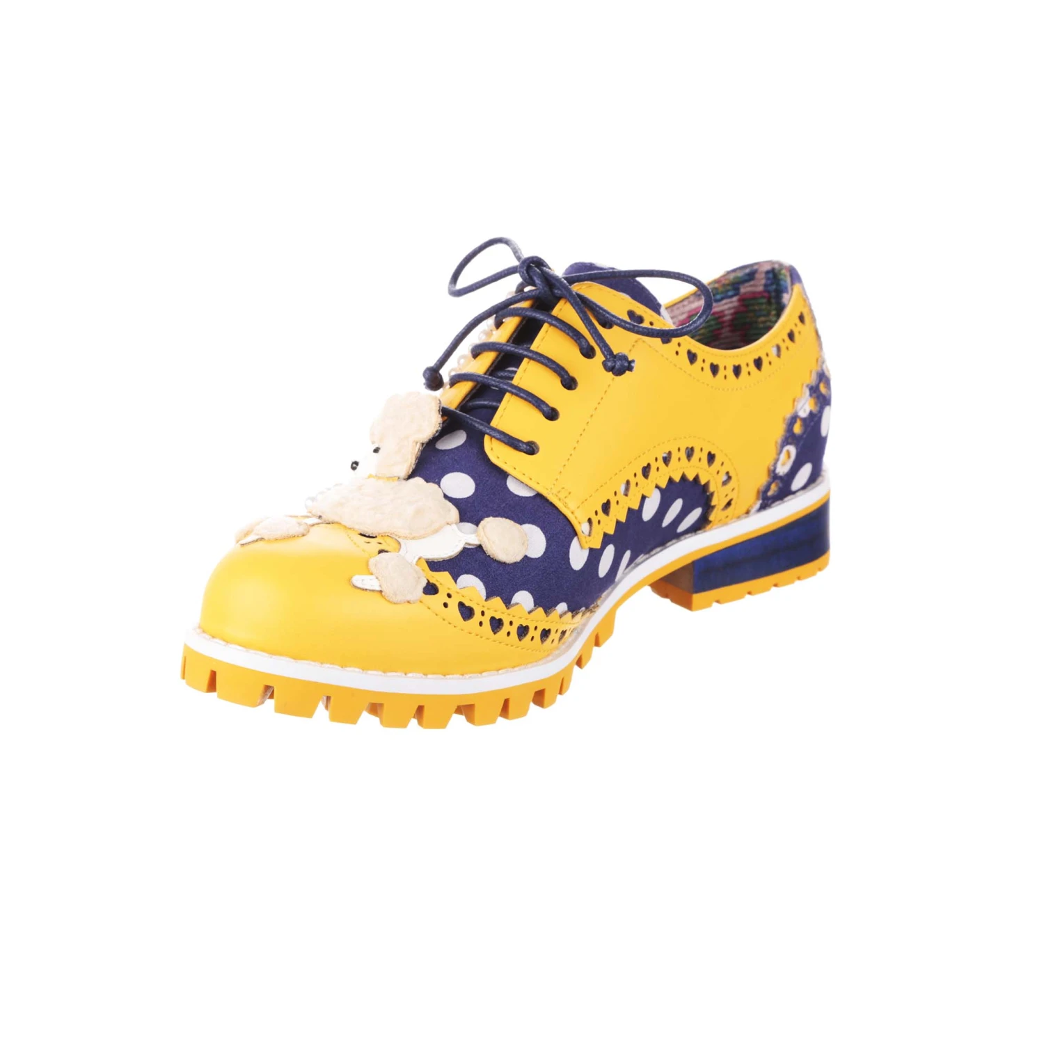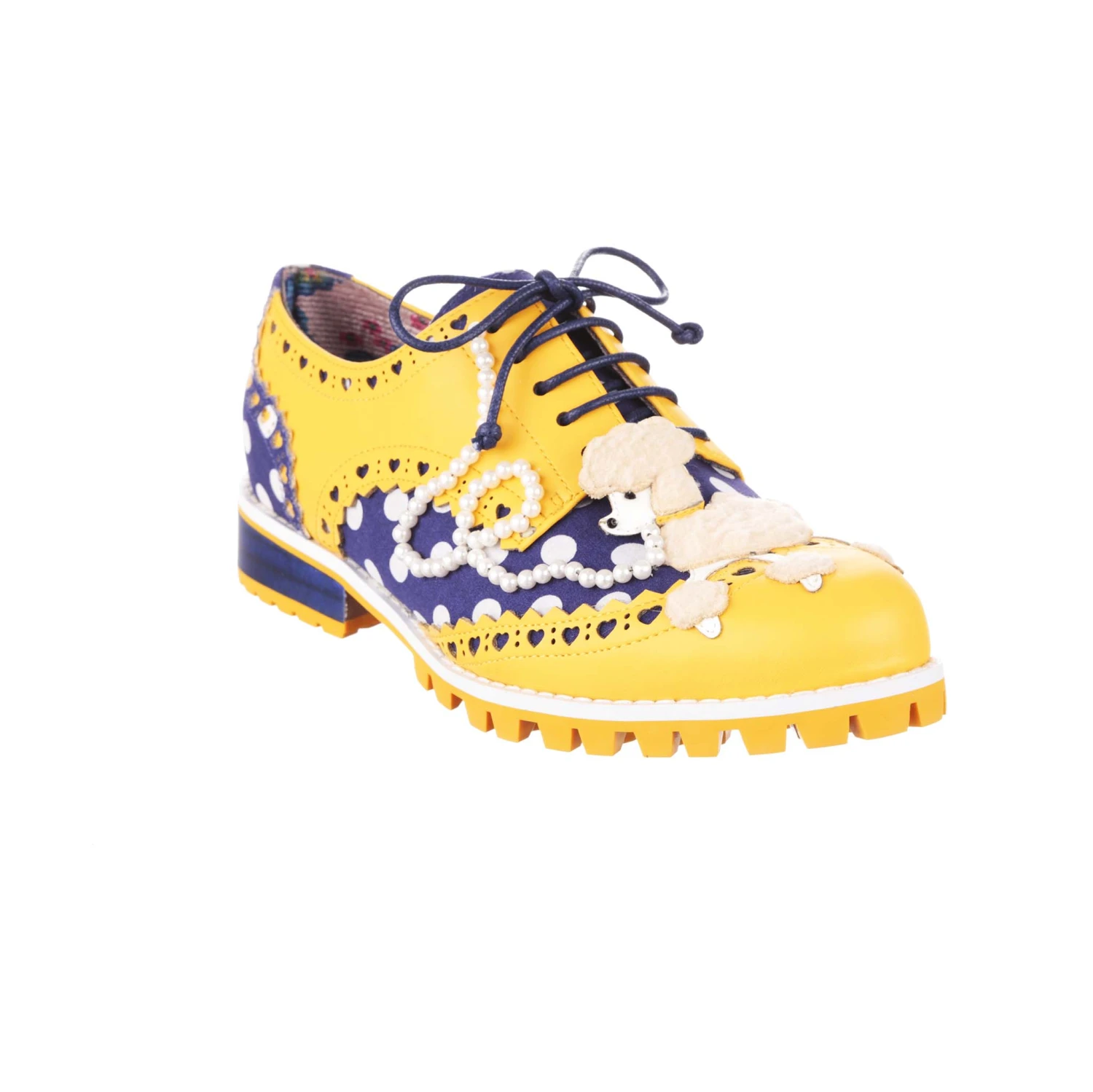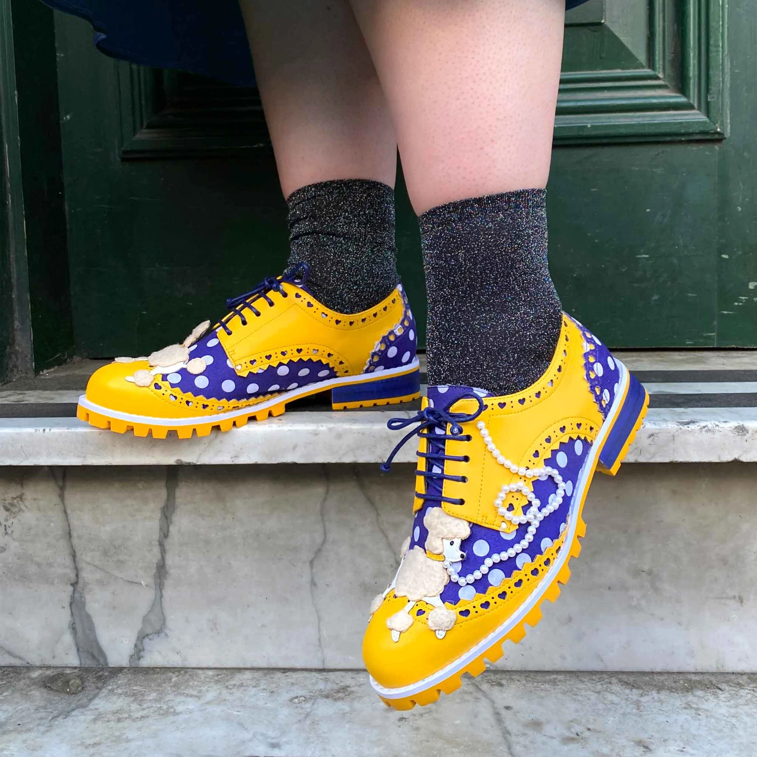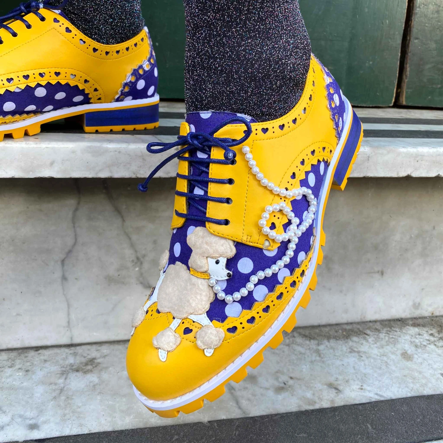 Woof woof! These brogues have us howling! The centrepiece of this shoe is the poodle applique on the toe, in white and fluffy cream faux fur and a pearl lead coiling down the side, leading up to the skinny navy laces. Gorgeous mustard, white and blue fabrics are combined in a brogue style shoe to make something really classic and elegant but also fun and irregular!