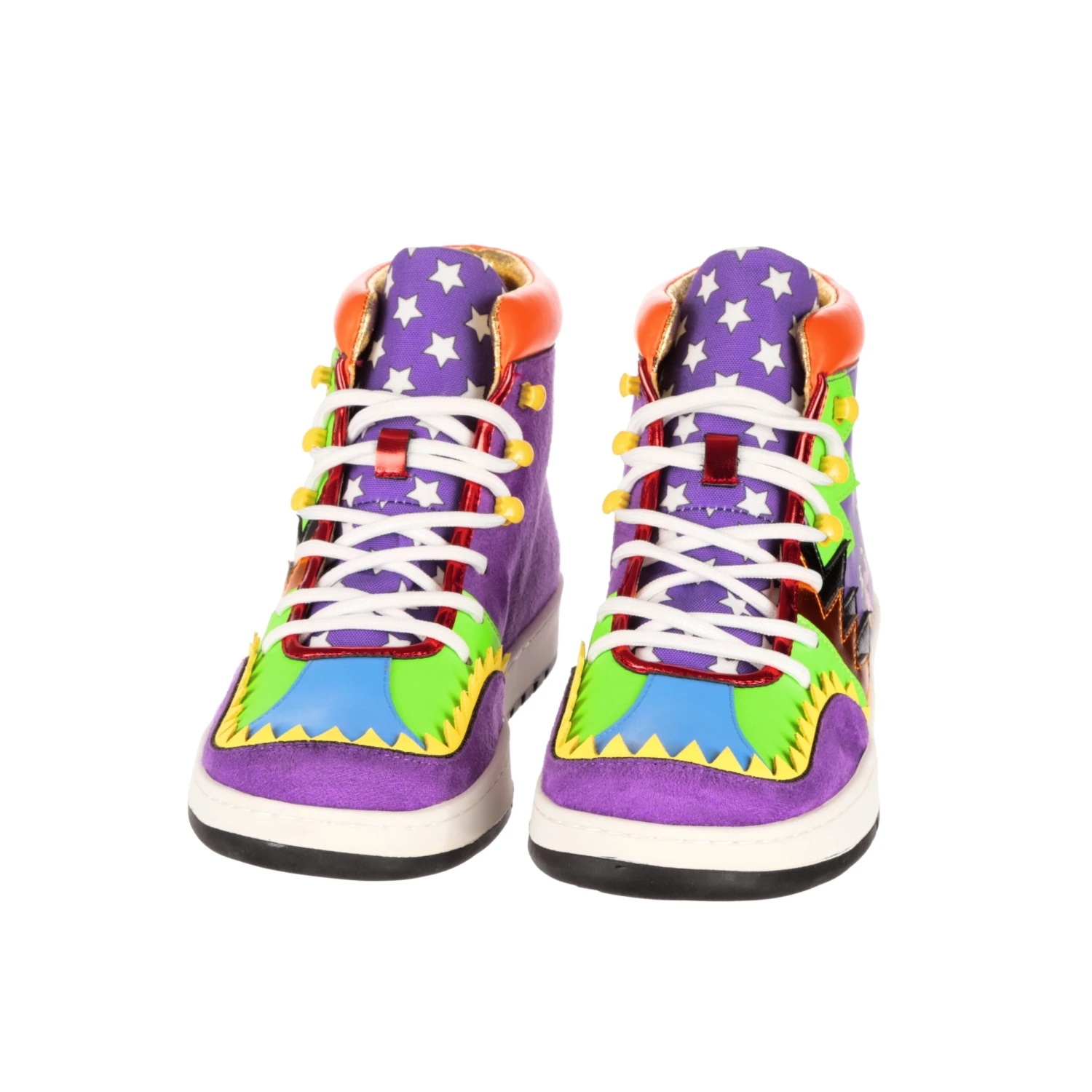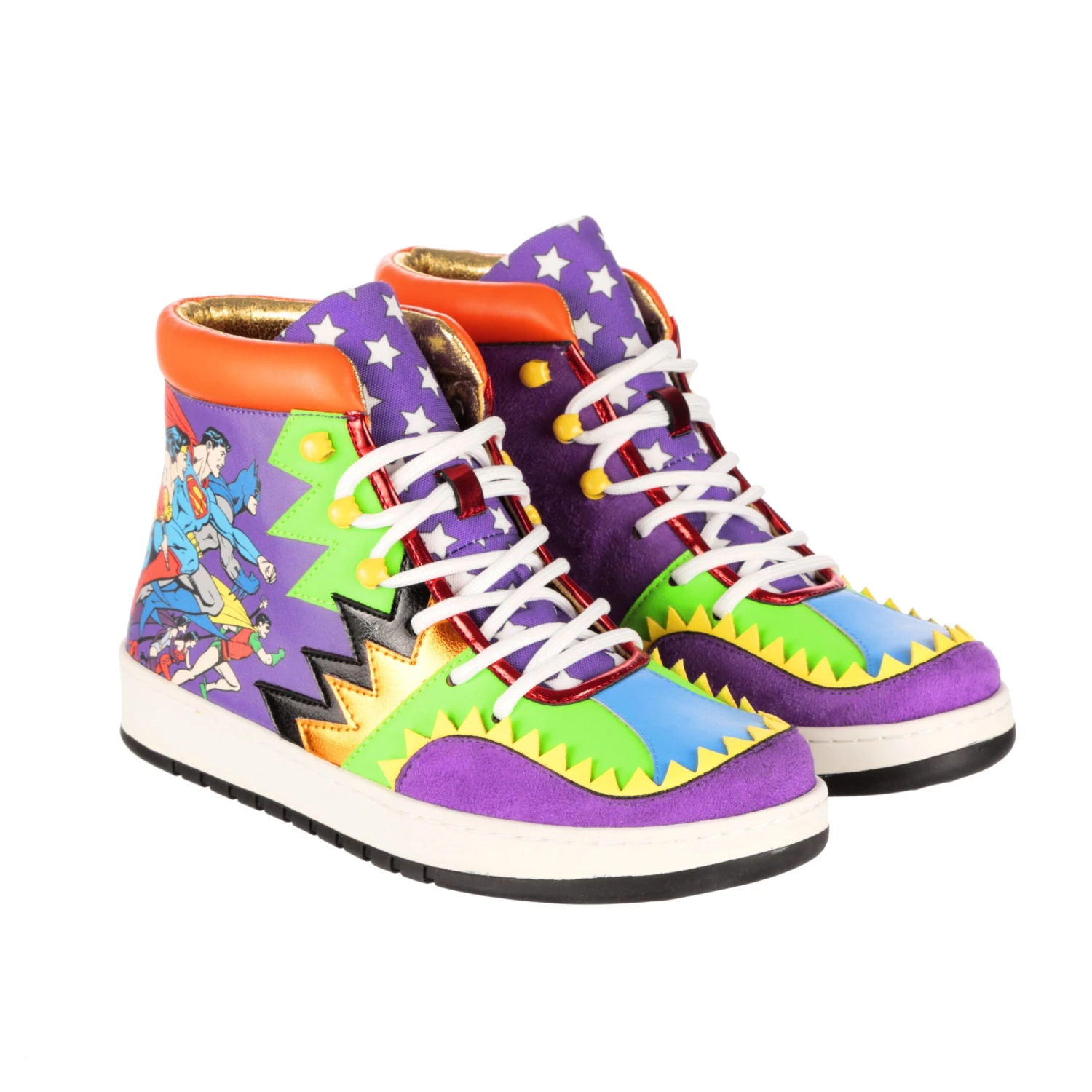 These funky trainers feature DC Super Heroes and Super-Villains, ready for battle! Our DC Super Heroes include Wonder Woman, Superman, Batman, Robin, Huntress, Wonder Girl, and Plastic Man; and the DC Super-Villains Metallo, The Penguin, Lex Luthor, and The Joker! A comfy high top lace up style, with bright comic book applique details and iconic DC comics graphics make this a perfect style for any fan!